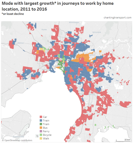 Here is a map showing the mode (out of car, train, tram, bus, ferry, bicycle, walk-only) that had the biggest increase in number of trips between 2011 and 2016, by SA2: