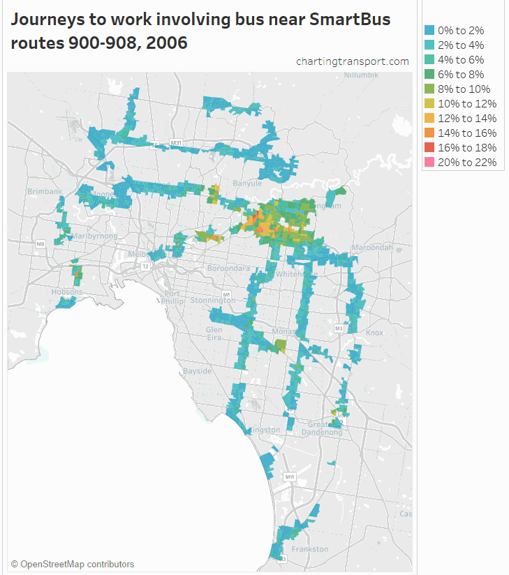 You can see plenty of mode shift in the Manningham area (where many SmartBus routes overlap), but also some mode shifts along the others routes – particularly in the south-east.