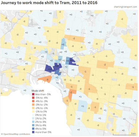 Overall tram mode share increased from 4.0% in 2006 to 4.6% in 2011 and 4.8% in 2016. Here’s a map of tram mode shift 2011 to 2016 by home SA2: