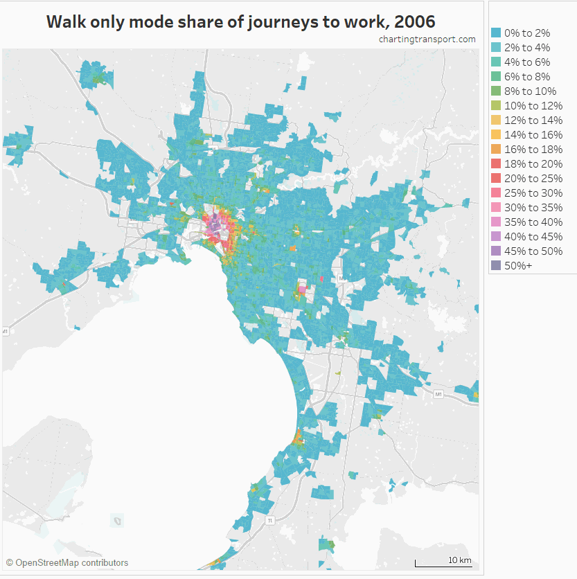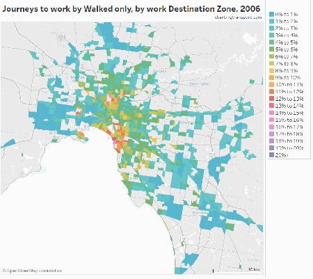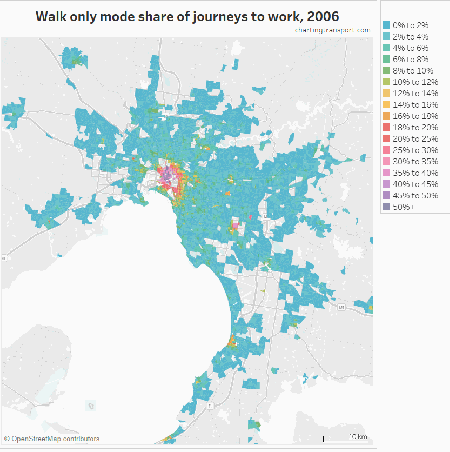 Overall walking-only mode share in Melbourne as measured by the census has hardly changed, from 3.6% in 2006 to 3.5% in both 2011 and 2016. However there are huge spatial variations.