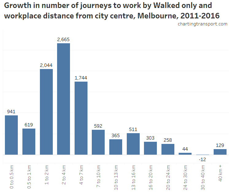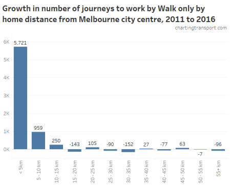 For workplaces, the biggest growth in walking was to jobs between 2-4 km from the CBD (be aware of different X-axis scales):
