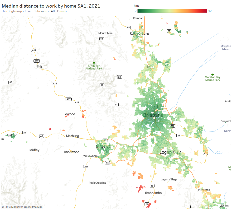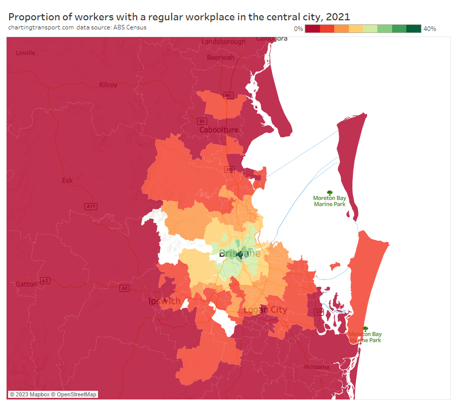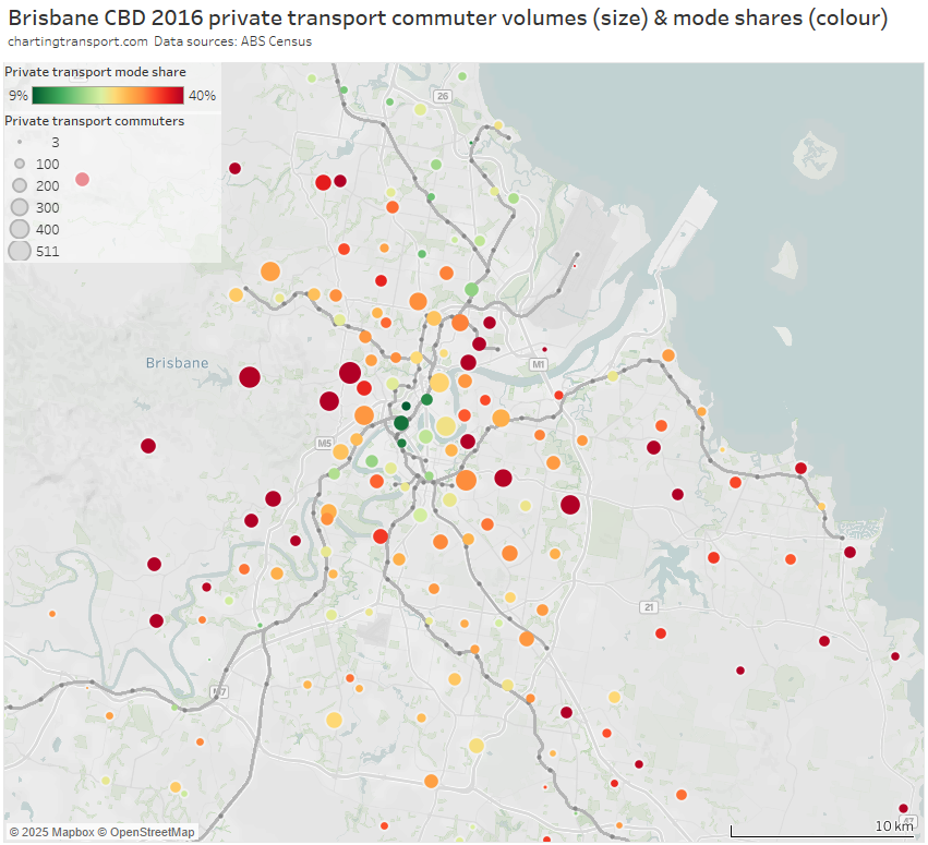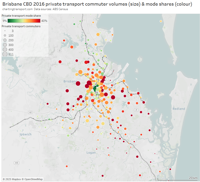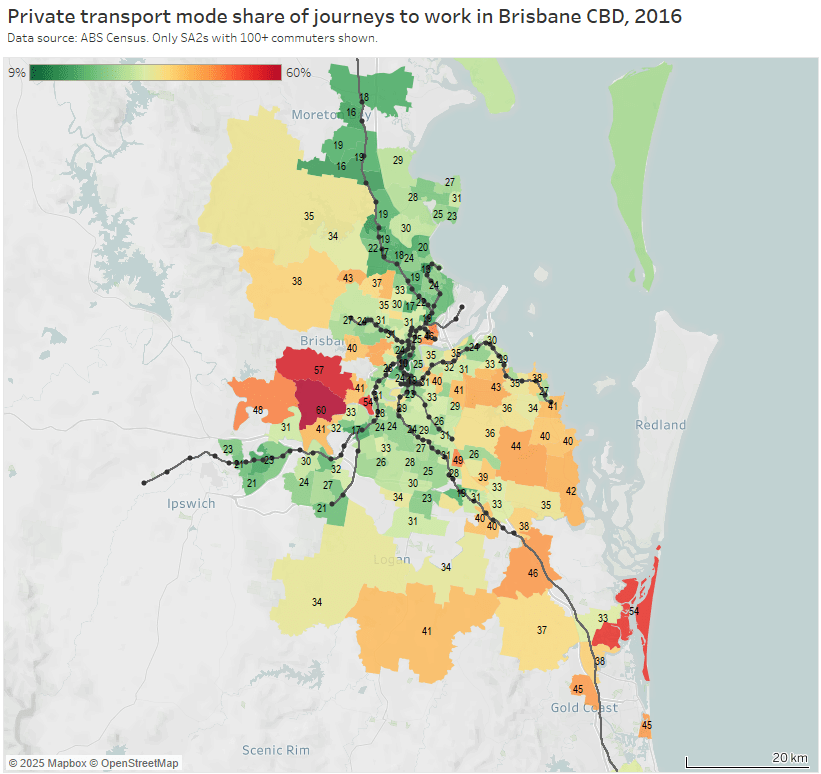 Note: the large green island to the north-east is Moreton Island, and it shares an SA2 with Scarborough and Newport on the mainland (very different areas!). I dare say there are unlikely to be many CBD commuters living on Moreton Island, and the 31% private mode share probably mostly reflects mainland commuters.