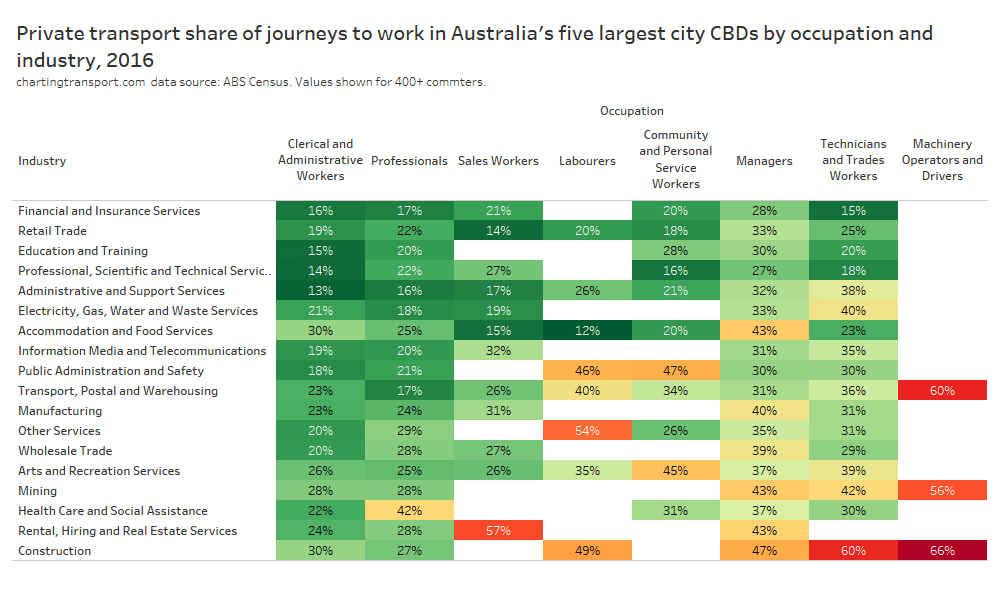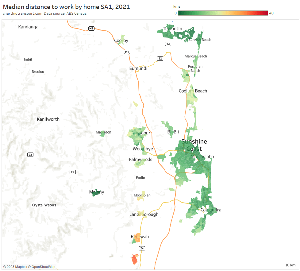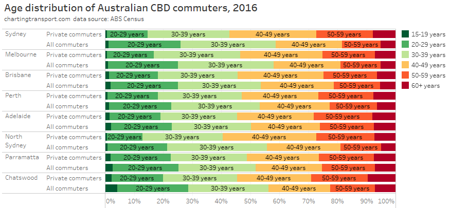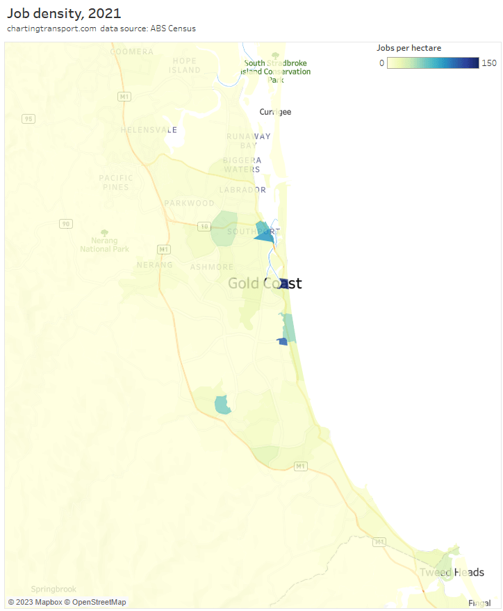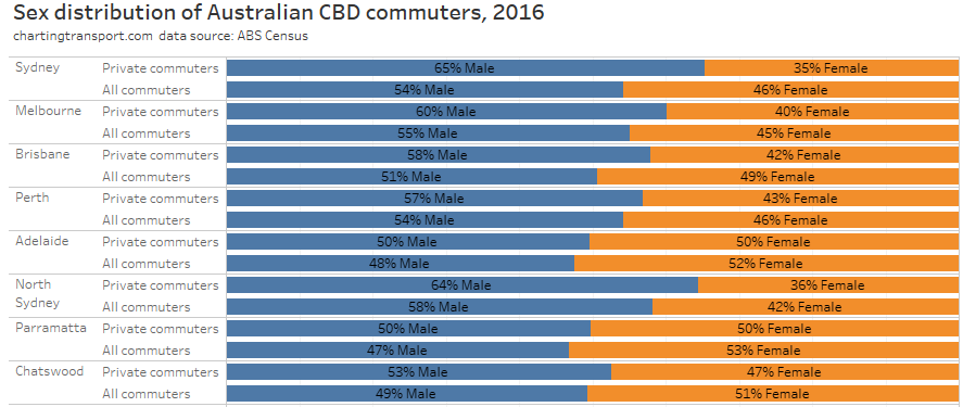 Note: the large green island to the north-east is Moreton Island, and it shares an SA2 with Scarborough and Newport on the mainland (very different areas!). I dare say there are unlikely to be many CBD commuters living on Moreton Island, and the 31% private mode share probably mostly reflects mainland commuters.