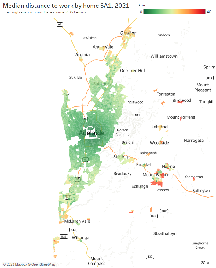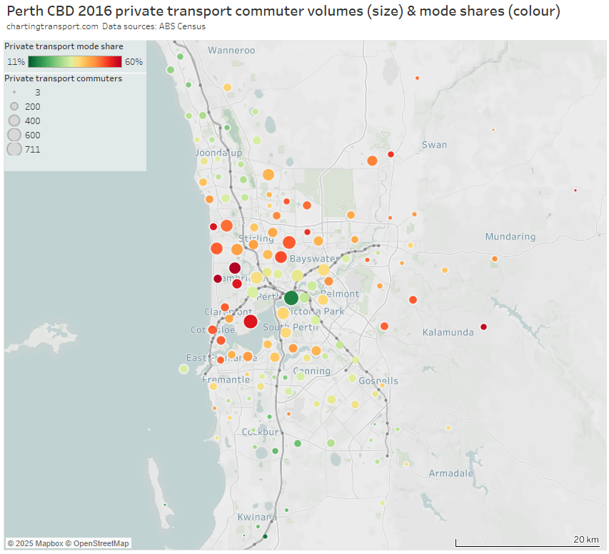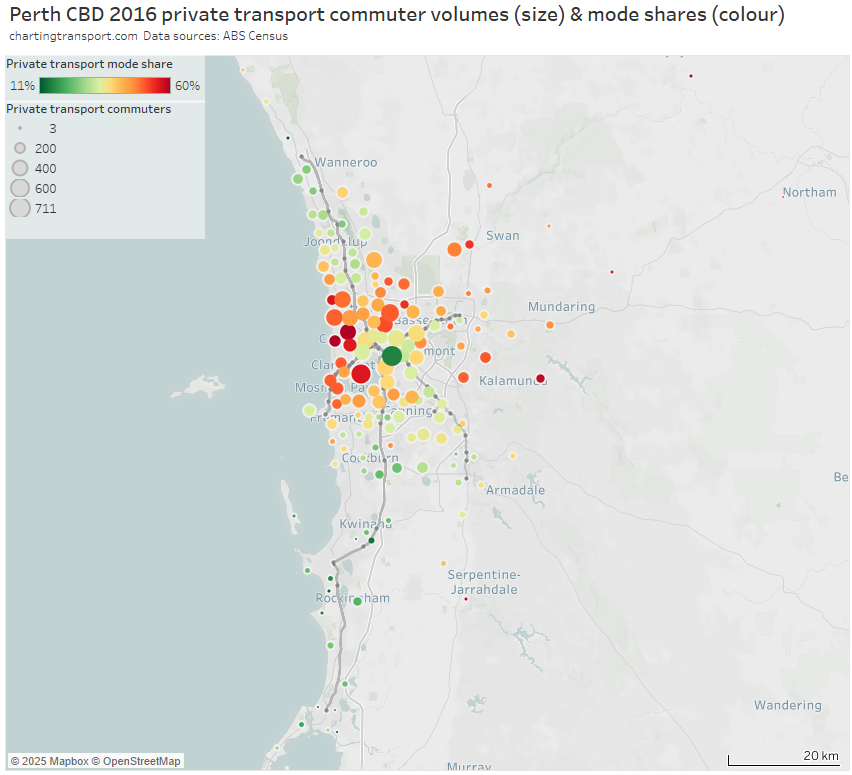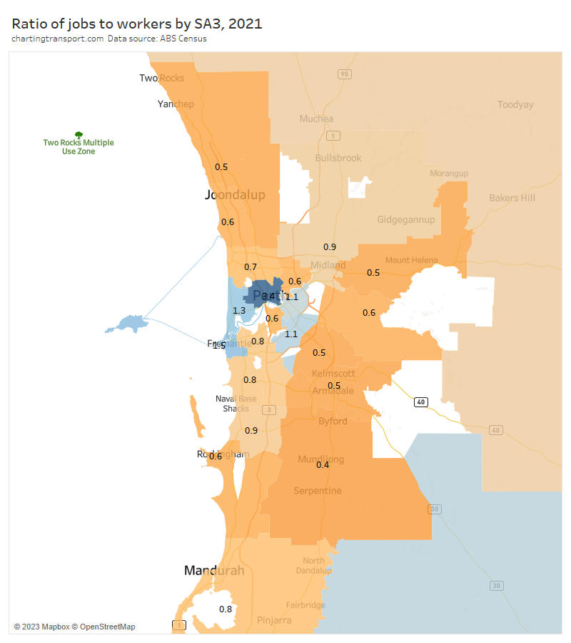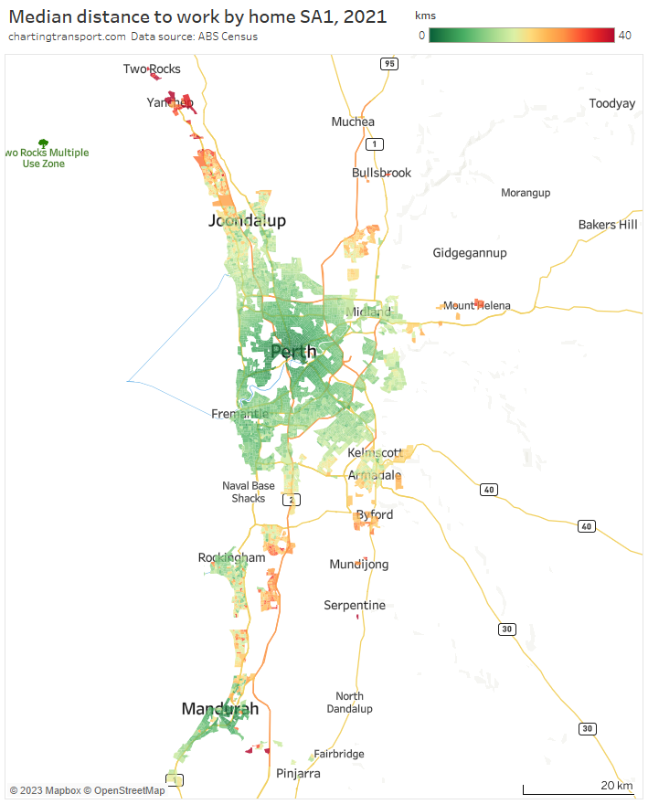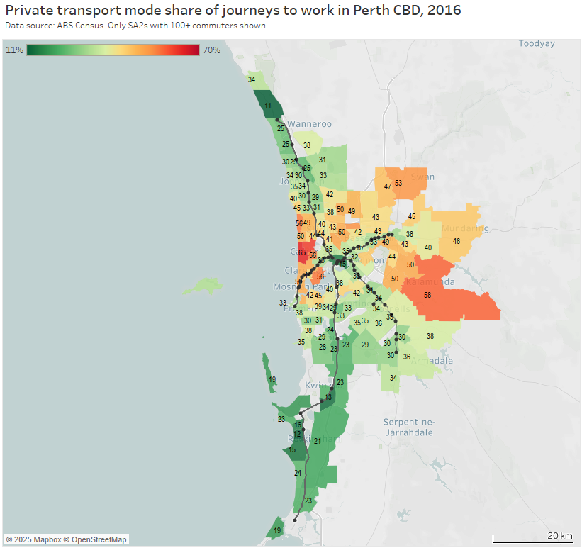 Note: Rottnest Island is included in the Fremantle SA2 but is unlikely to have had many Perth CBD commuters, so the colouring is probably misleading (same issue as Moreton Island).