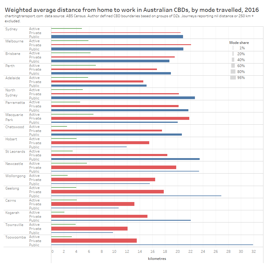 Could public transport fare policies explain differences between cities? In Adelaide and Melbourne it is no more expensive to travel to the CBD from the outer suburbs than the inner suburbs, making public transport travel from the outer suburbs more cost-competitive. Sydney, Perth, and Brisbane had fares roughly proportional to travel distance in 2016, yet private transport mode shares were still relatively low in the outer suburbs. This suggests outer suburban commuters might not be highly sensitive to public transport fares, as other factors likely drive mode choice.