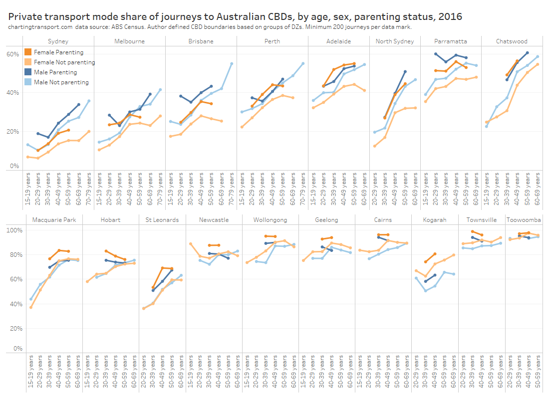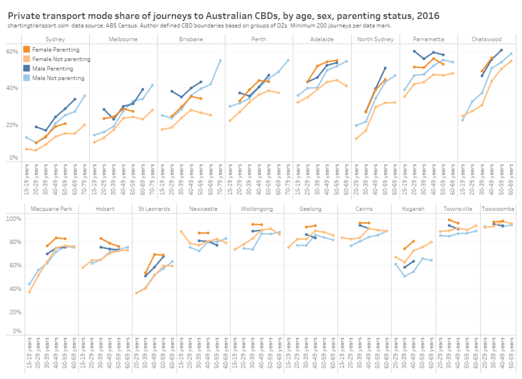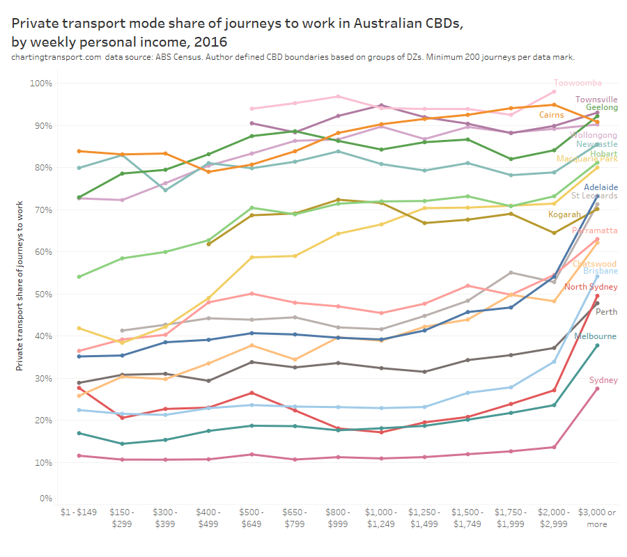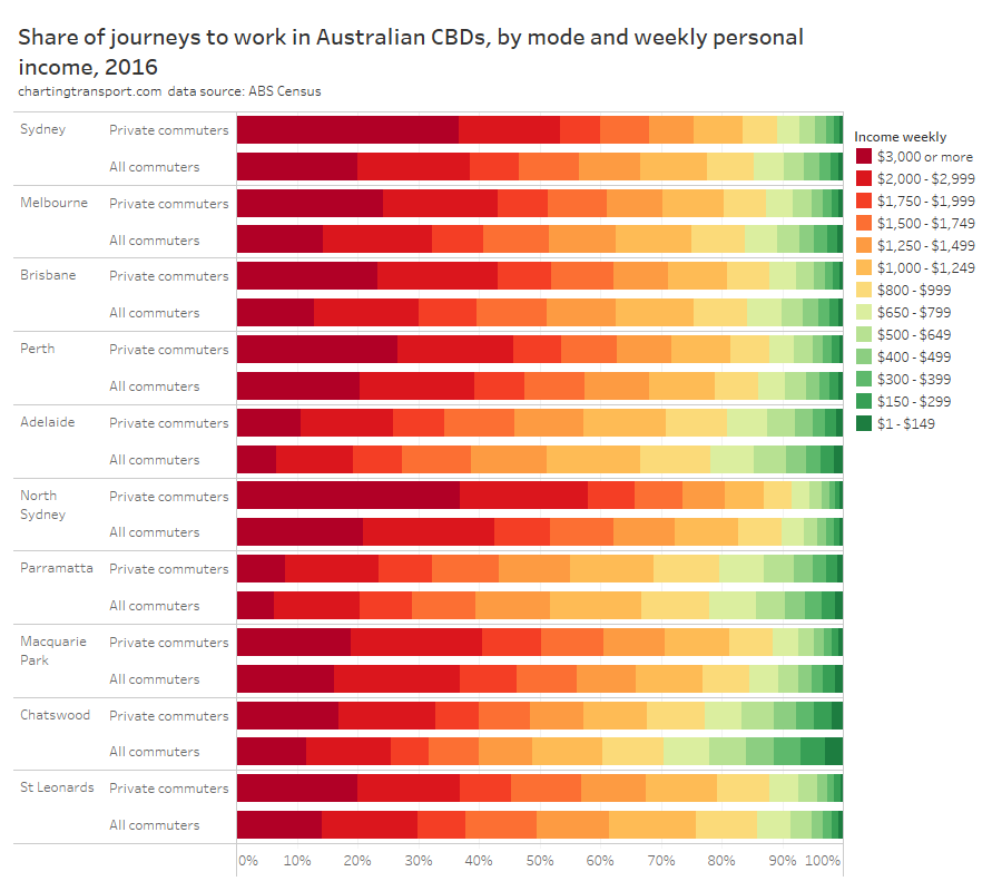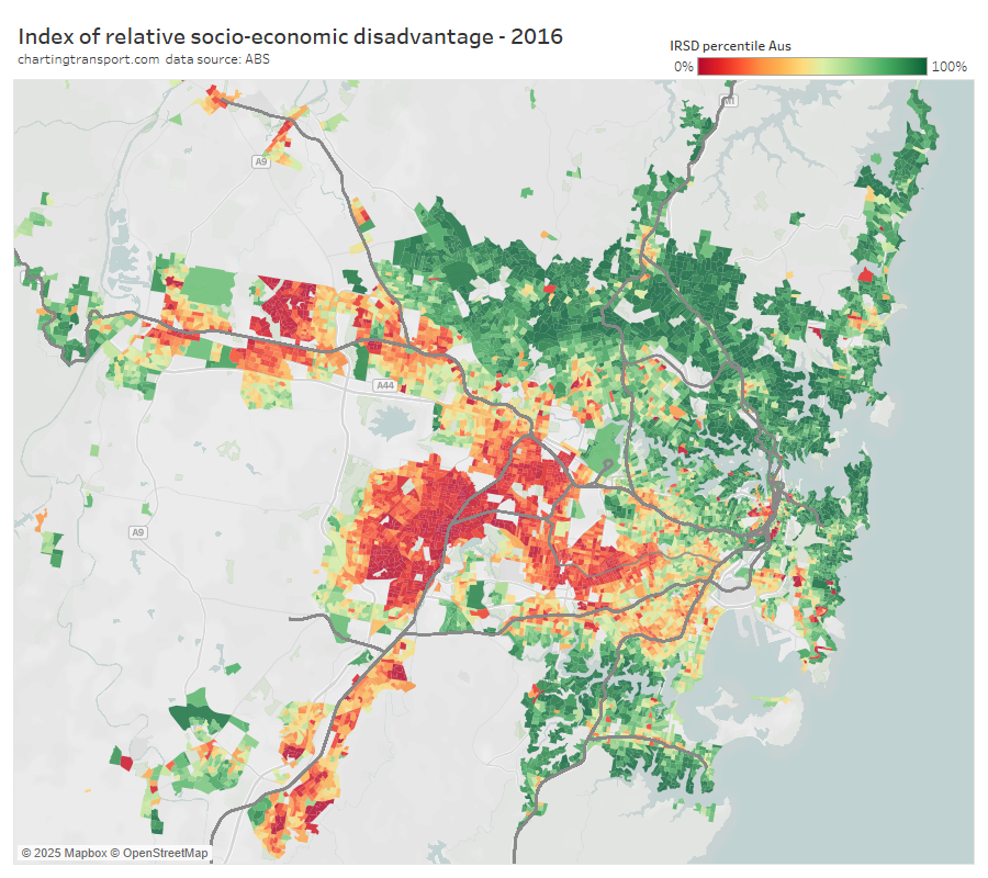 - There’s only so much you can do in the most socio-economically advantaged suburbs: Many cities have areas that are well served by rapid transit but still have high private transport mode shares. These tend to be some of the most advantaged suburbs, where many CBD workers are likely to be on high incomes and don’t wear the costs of private commuting. Shifting these commuters to public transport would probably require significant private transport disincentives.