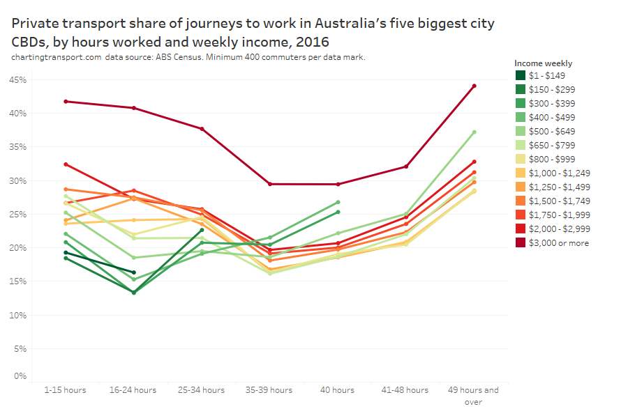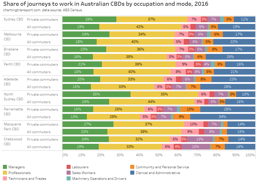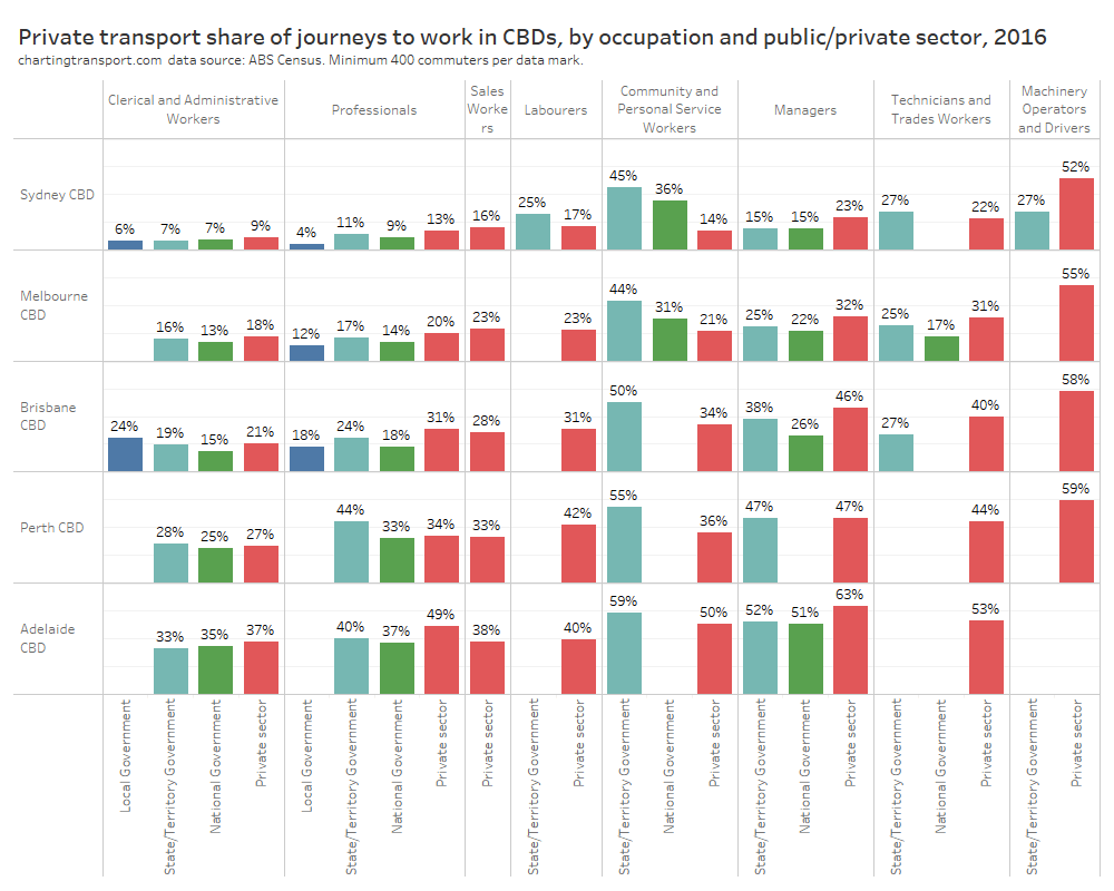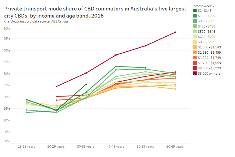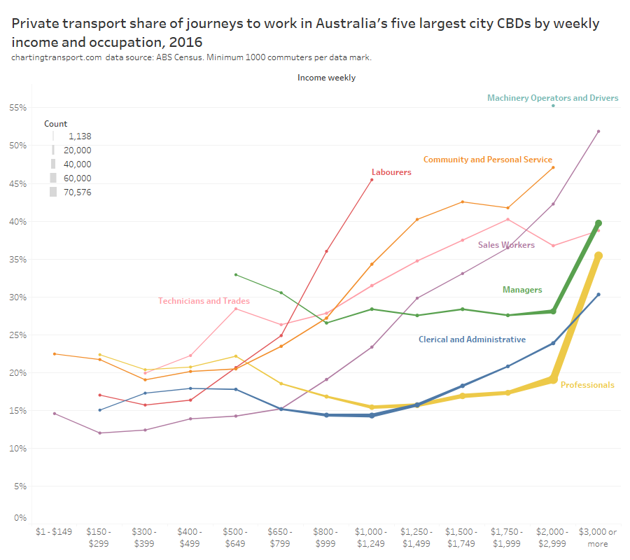 - There’s only so much you can do in the most socio-economically advantaged suburbs: Many cities have areas that are well served by rapid transit but still have high private transport mode shares. These tend to be some of the most advantaged suburbs, where many CBD workers are likely to be on high incomes and don’t wear the costs of private commuting. Shifting these commuters to public transport would probably require significant private transport disincentives.