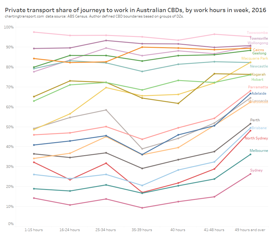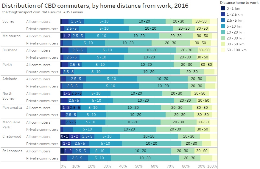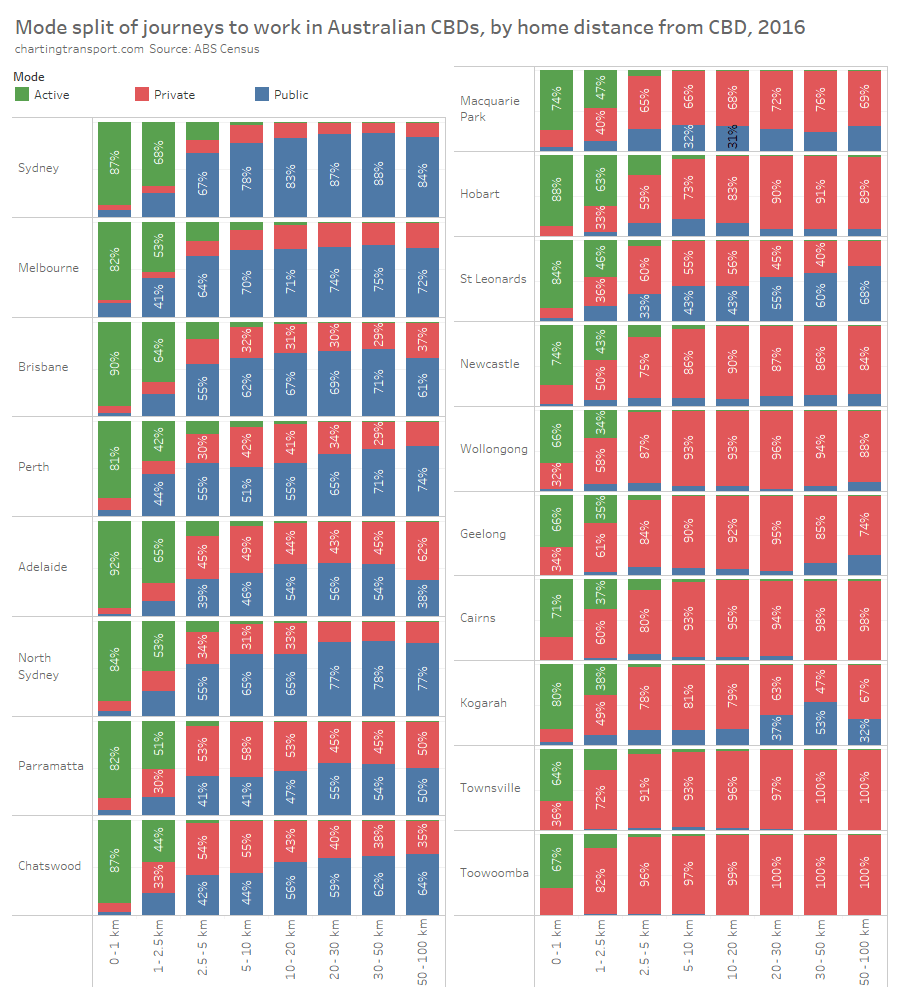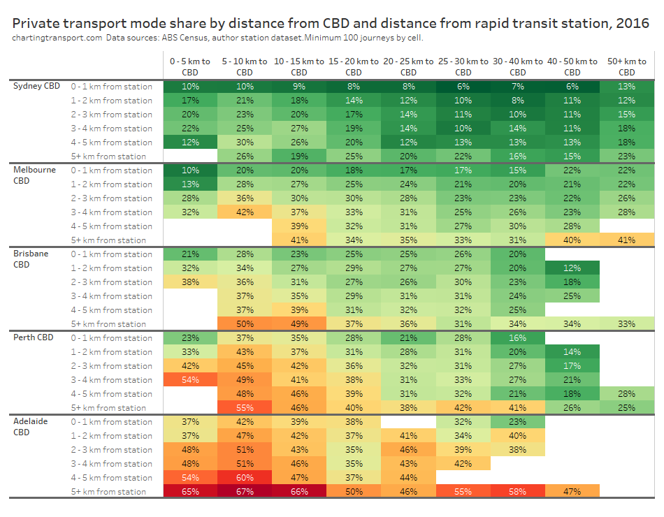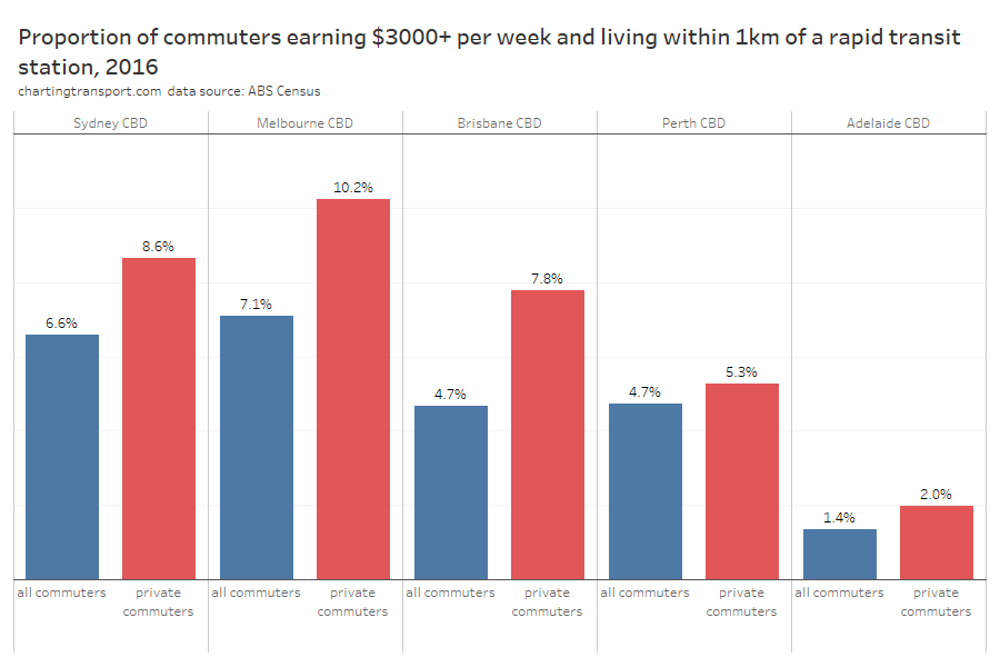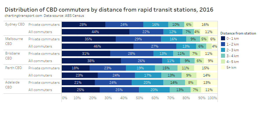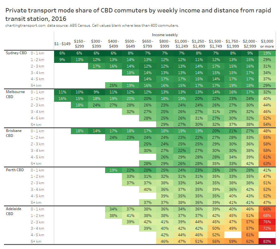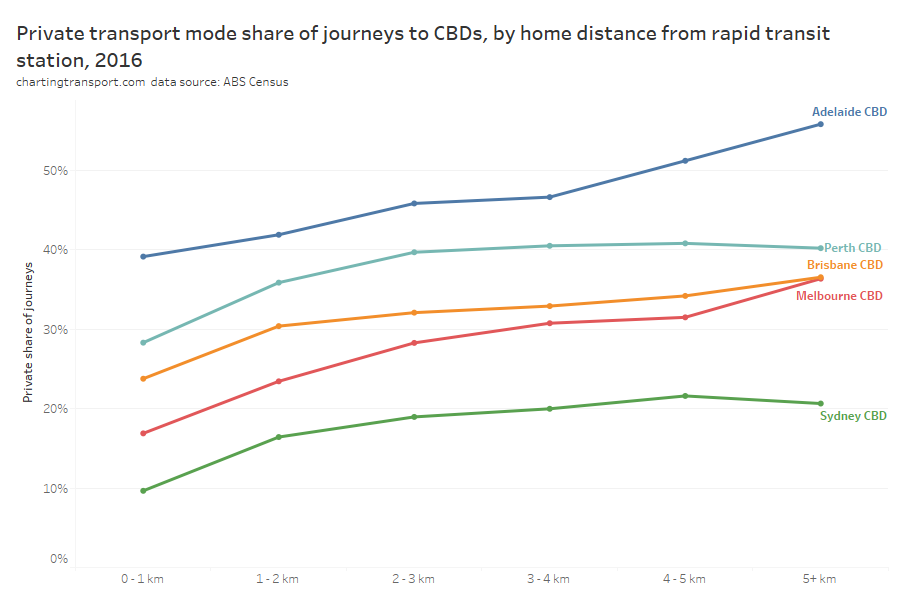 Within each city, some of the the highest private transport mode shares were seen for commuters living 5-10 km from their CBD and being distant from a rapid transit station. For these commuters private transport is likely often more cost- and time- competitive than on-road public transport. These areas are often highly advantaged suburbs, where CBD parking costs might be less of a concern for commuters.