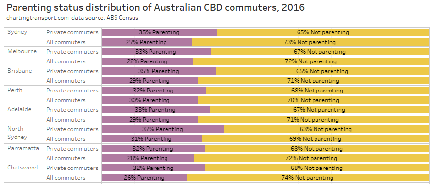 Private transport mode shares were often lower for suburbs further from CBDs, even those not adjacent to rapid transit stations. For these commuters park-and-ride or bus feeder travel to train lines is likely more competitive with driving. These commuters can often be less socio-economically advantaged – and so a long drive to expensive CBD parking each day would be a significant barrier. For many parts of Sydney and Melbourne, such longer distance car commutes might also pass through several motorway toll gates.