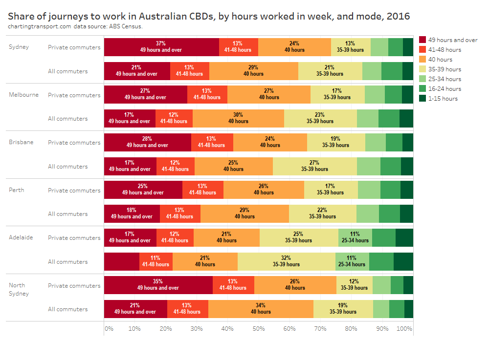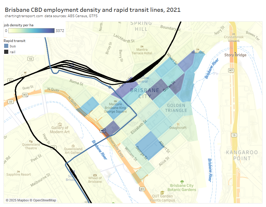 - CBD train stations probably need to be central to dense employment zones to win mode share: Adelaide and Brisbane currently lack train stations in the centre of their CBDs which makes public transport less competitive for CBD destinations more remote from stations. Brisbane will address this problem with Cross River Rail and Adelaide wants to plan for new underground rail.