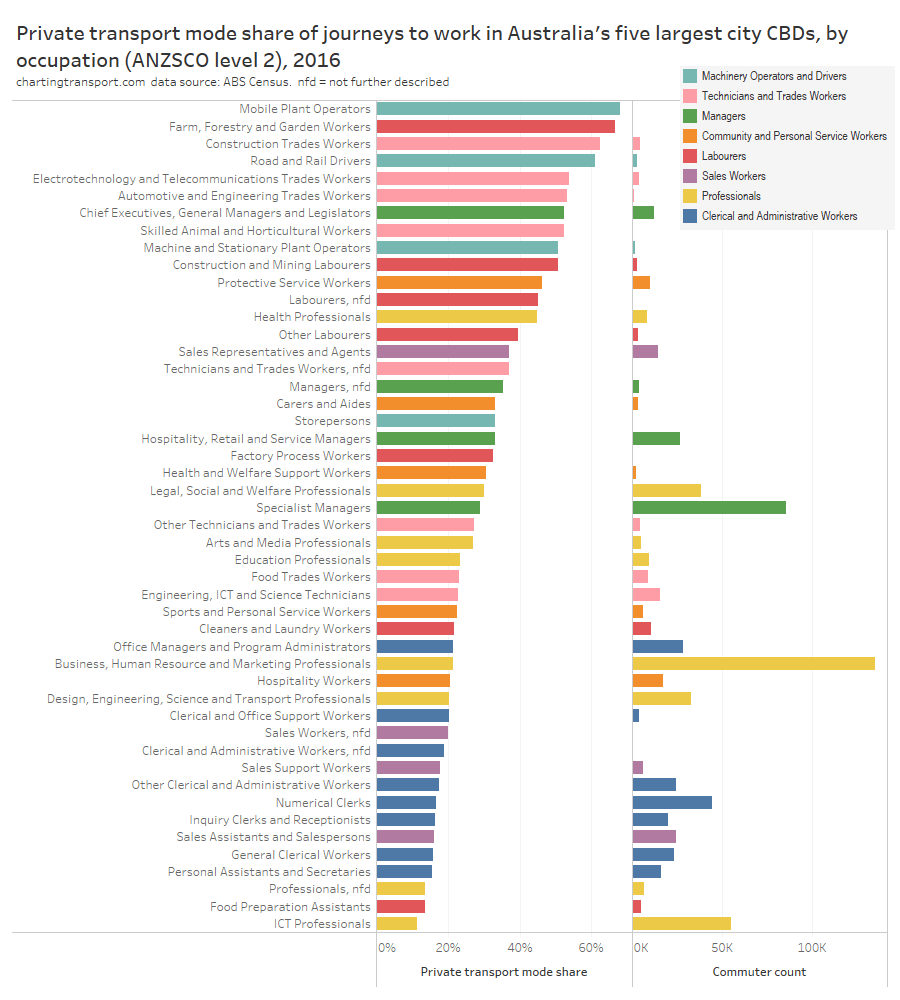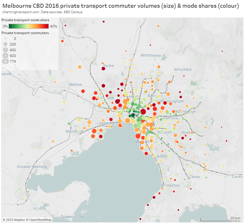 The next chart shows both the CBD private transport volumes and mode share at home SA2 geography. Areas with large circles that are orange to red are generating large volumes of private transport trips at a relatively high private transport mode share.
