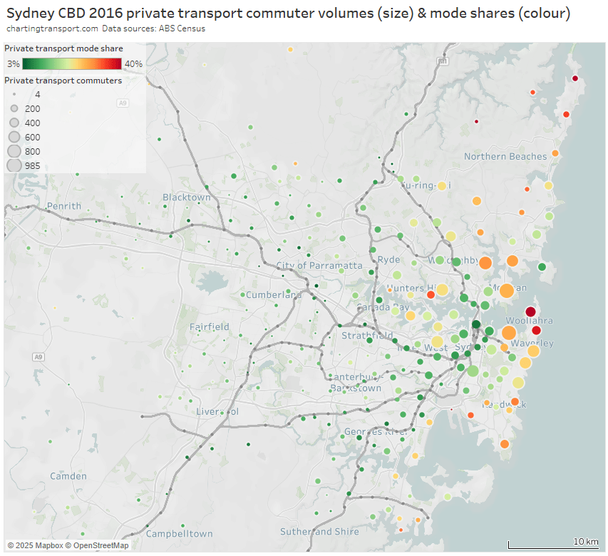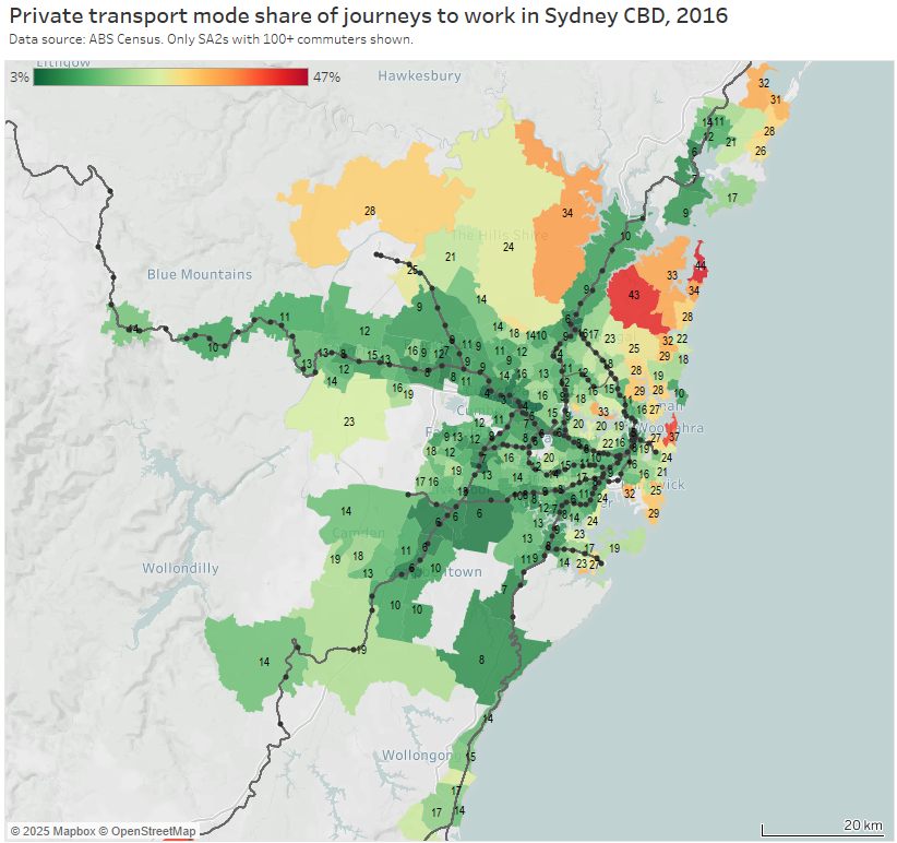 Here’s the private transport mode share of journeys to the Sydney CBD by home SA2 for 2016:
