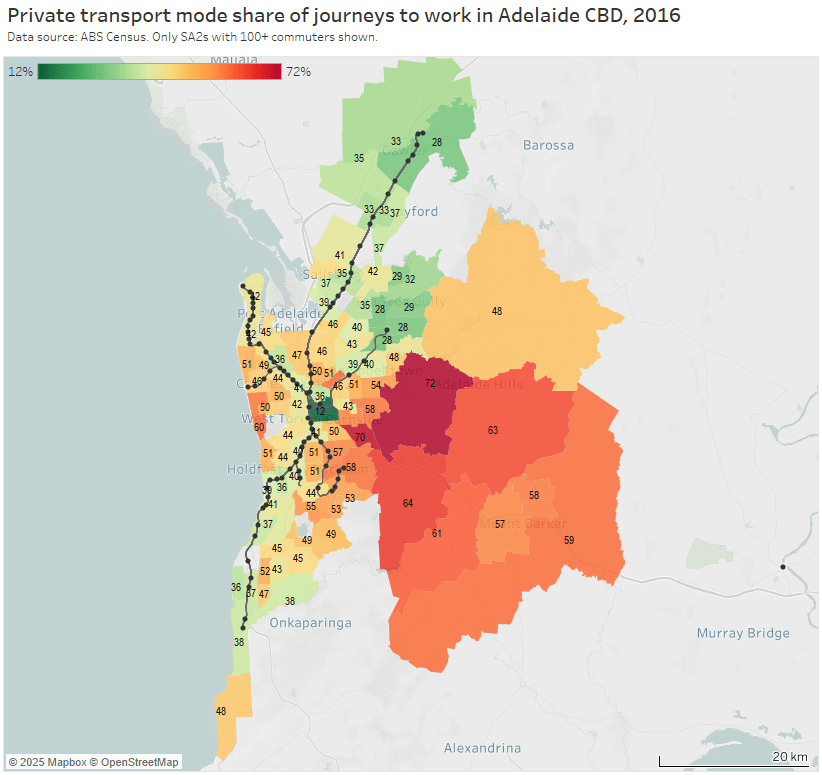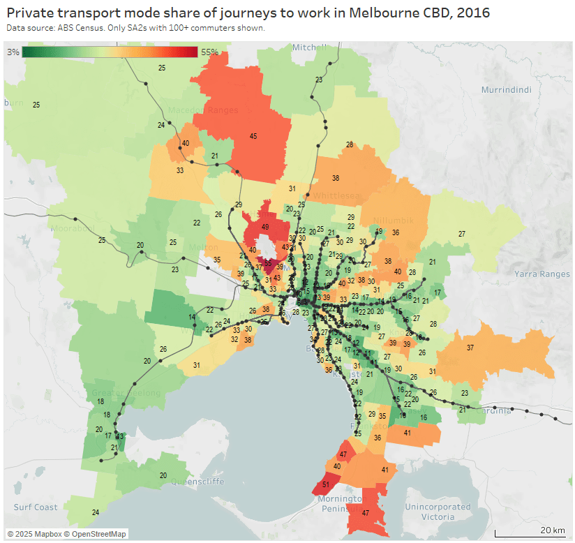 For the private transport volume and mode share map I’ve had to stretch the colour scale to max out at 60% to better differentiate the SA2s: