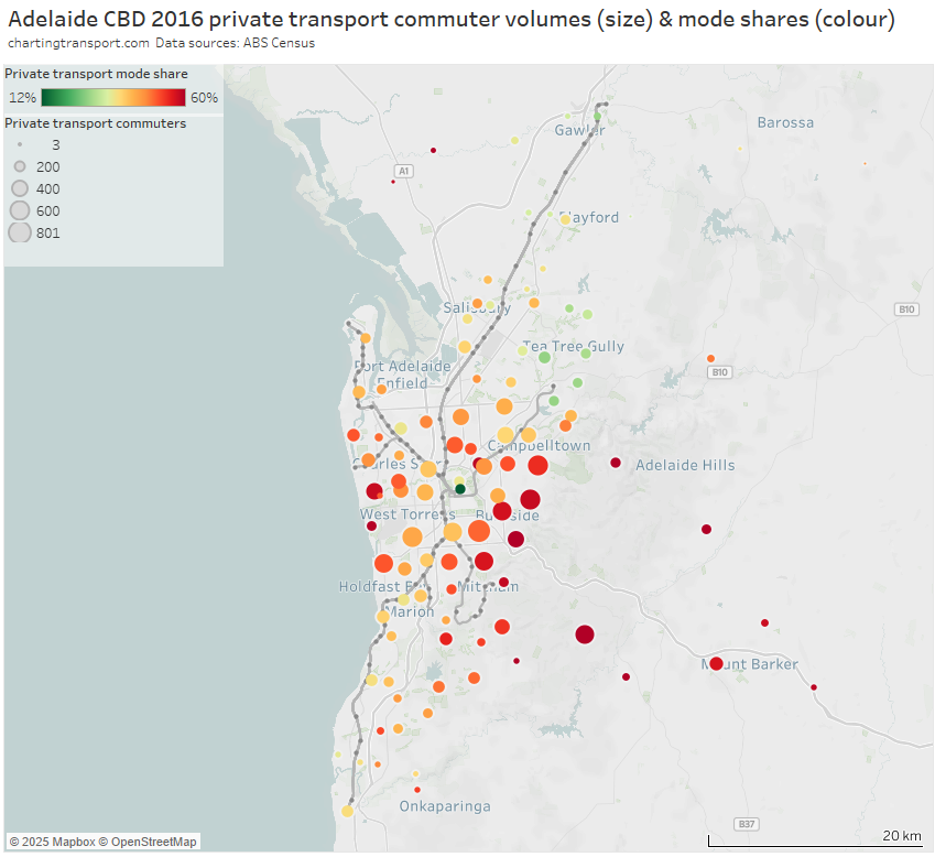 In my last post on this topic, I asked the question: who drives to work in major Australian city CBDs? This post will now look at where these drivers came from, and more specifically which parts of each city produced disproportionately large volumes of CBD drivers at high mode shares. I’ll also explore why some rapid transit lines are less successful at winning CBD commuter mode share.