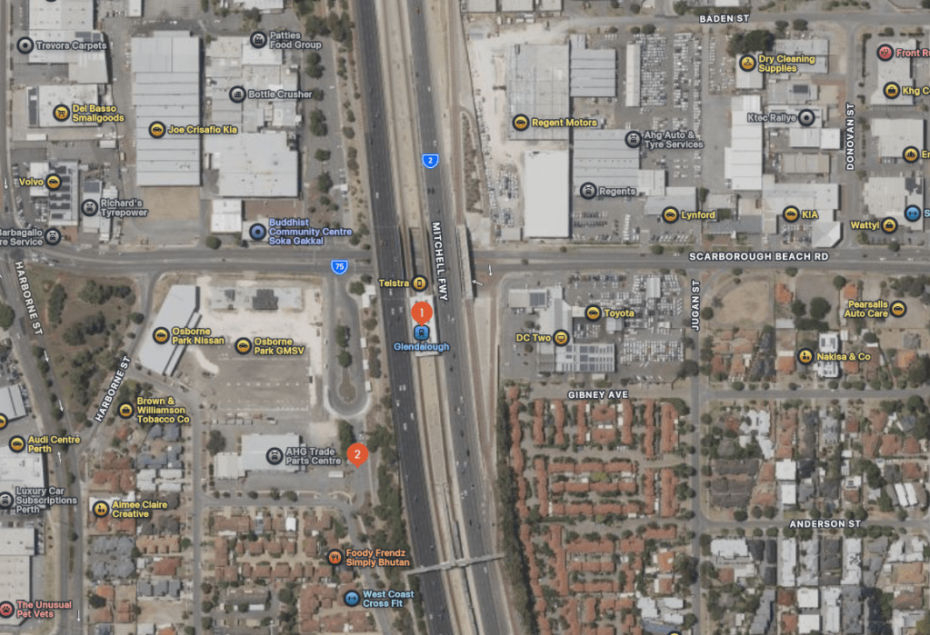 To further illustrate the station catchment issues, here’s a screengrab from Apple maps for Glendalough station on the Joondalup line, about 6 km from the Perth CBD: