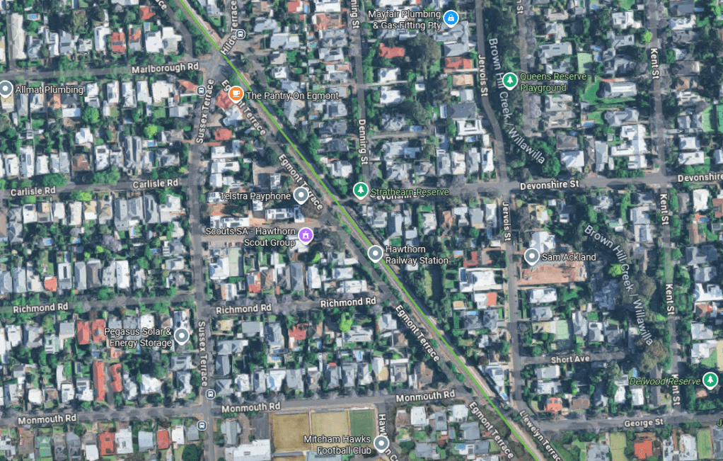 Below is a Google maps screengrab of Adelaide’s Hawthorn station on the Belair line, about 5 km south of the CBD, where trains run about every 15 minutes in peak periods. The station is surrounded by low density residential areas, with many blocks big enough to accommodate private swimming pools. There’s not even a hint of transit orientated development here, which seems typical of most Adelaide train stations, even those in the inner suburbs with decent frequencies (as a Melbournian I find this scenario rather foreign!). Without a concentration of population around rapid transit stations, you are likely to see lower public transport mode shares at SA2 geography.