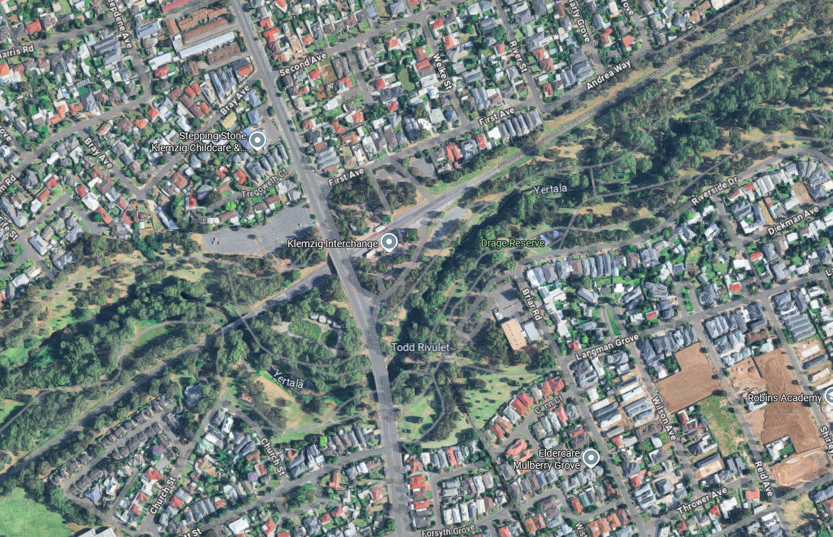 However the O-Bahn’s speed and alignment provides much less utility to the inner suburbs, in a very similar way to Perth’s Joondalup and Mandurah railway lines. Below is a Google Maps screengrab of Klemzig interchange O-Bahn station, about 6km from the Adelaide CBD. The station is immediately surrounded by car parks and beautiful parklands, and then relatively low density residential (peppered with a few terrace/townhouses). This makes for a rather limited walking catchment population.