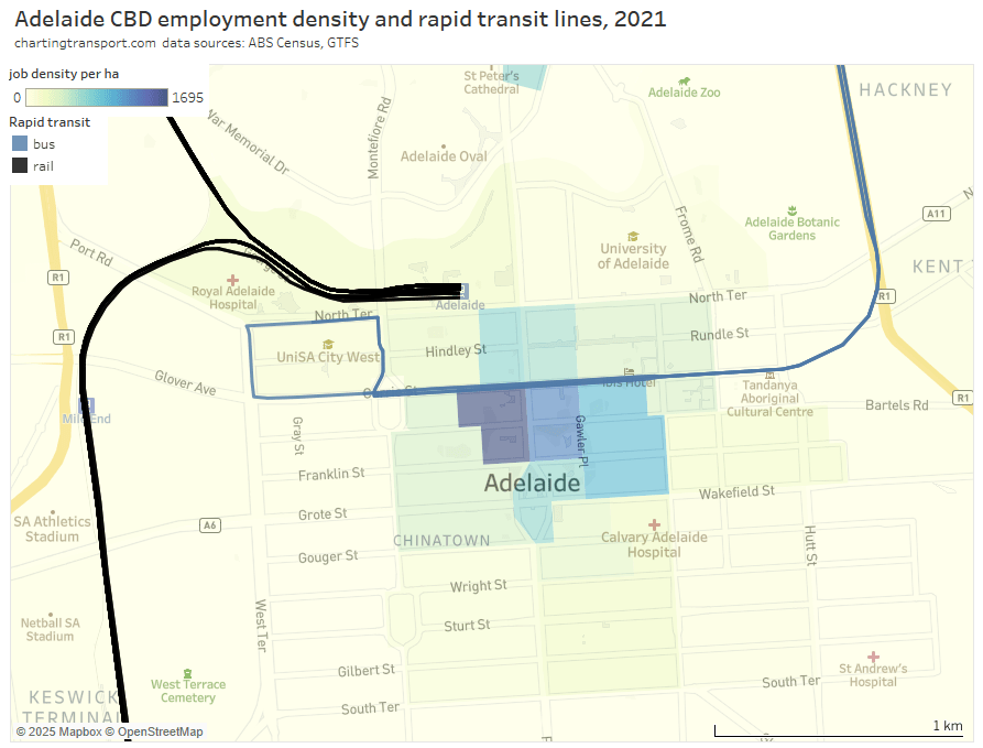 For those less familiar with the Adelaide CBD, here’s a map showing the train lines and O-Bahn bus corridor (the busway component actually ends at the eastern edge of the CBD), on top of employment density. Adelaide Train Station is unfortunately just outside the dense core of the CBD with many potential commuters having to walk several blocks.