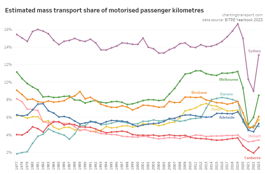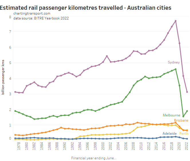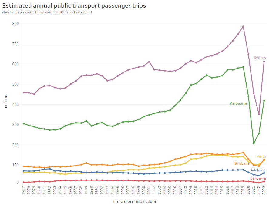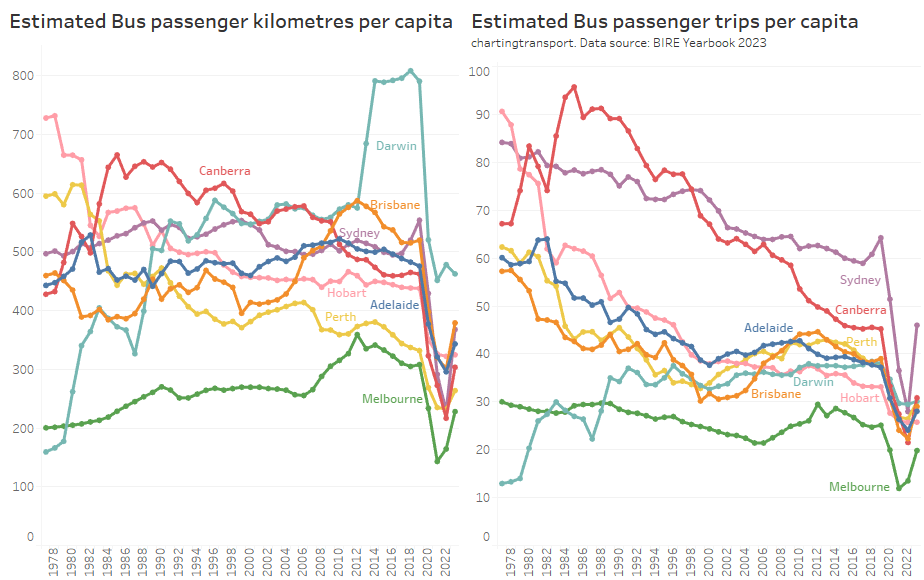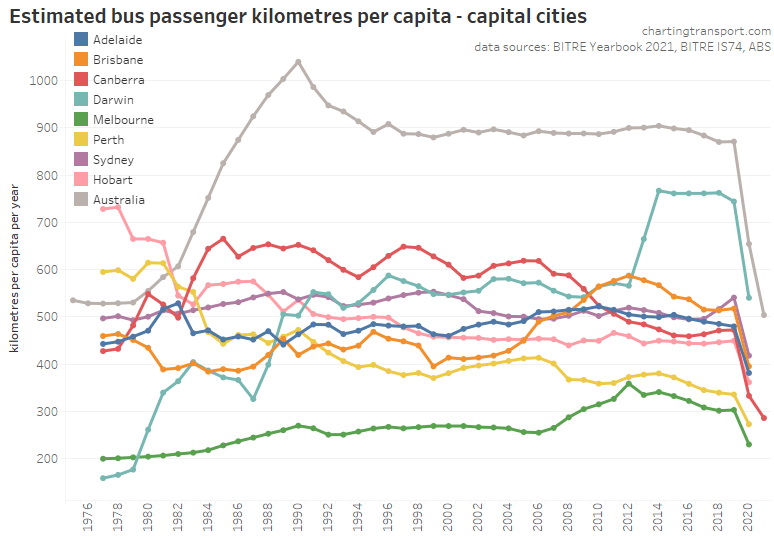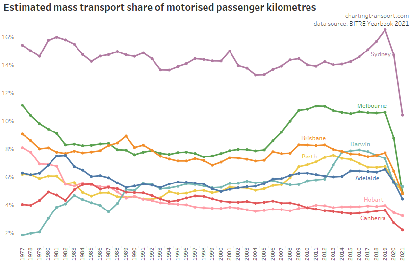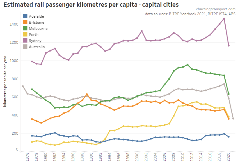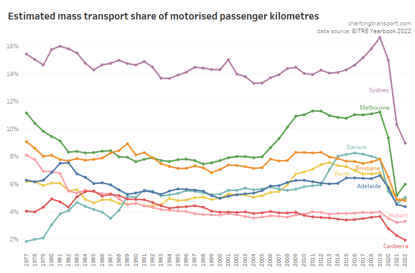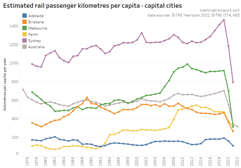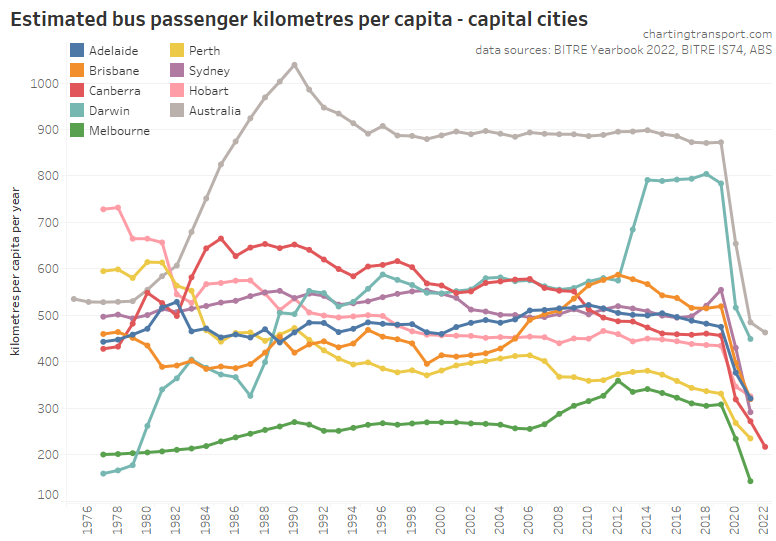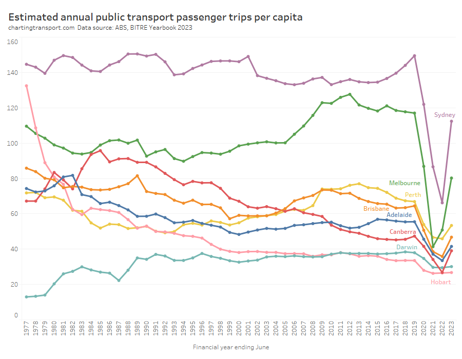 This chart produces some unexpected outliers. Hobart shows up with very high public transport trips per capita in the 1970s, which might be relate to the Tasman Bridge Disaster which severed the bridge between 1975 and 1977 and resulted in significant ferry traffic for a few years (over 7 millions trips in 1976-77). Canberra also shows up with remarkably high trips per capita in the 1980s for a relatively small, low density, car-friendly city, but has been in steady decline since.