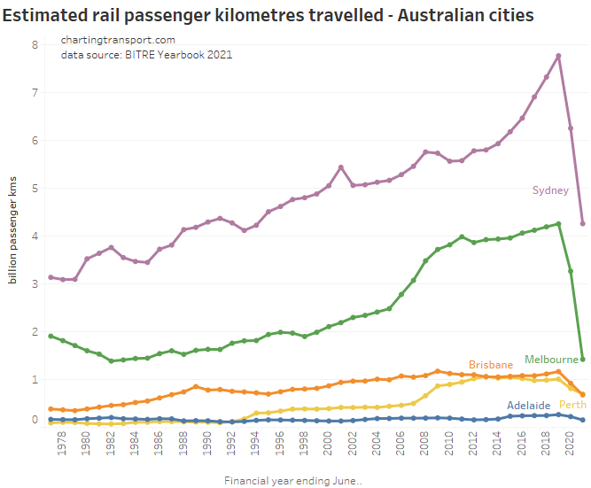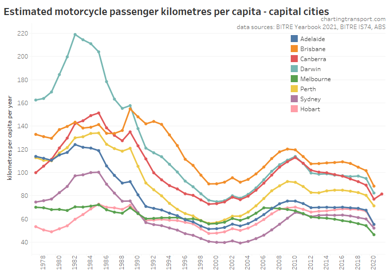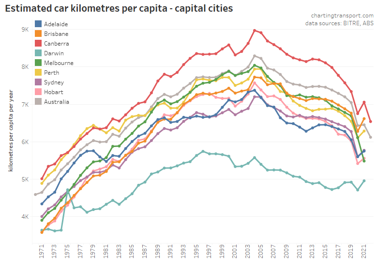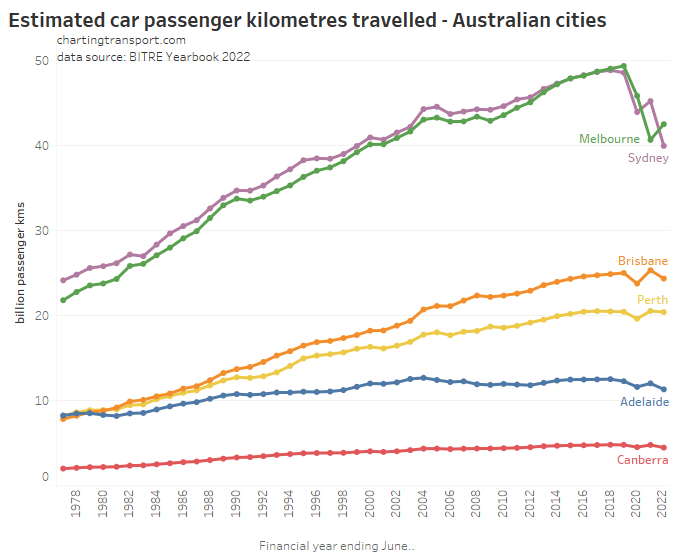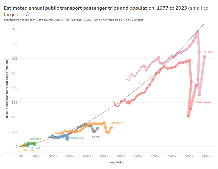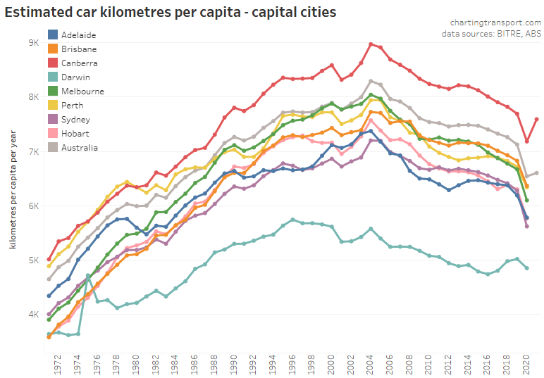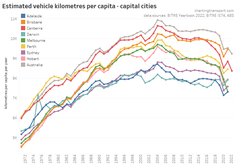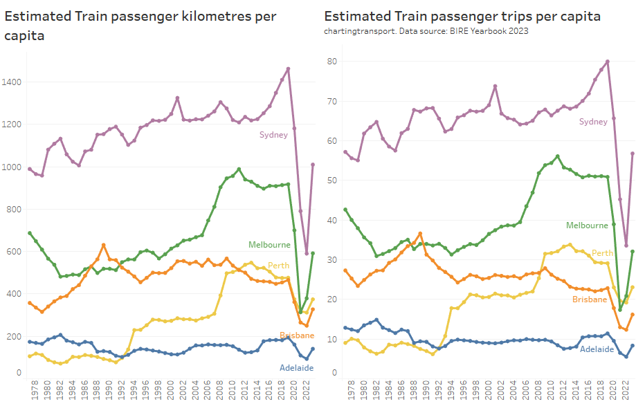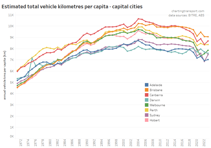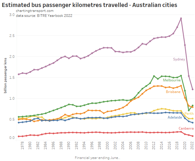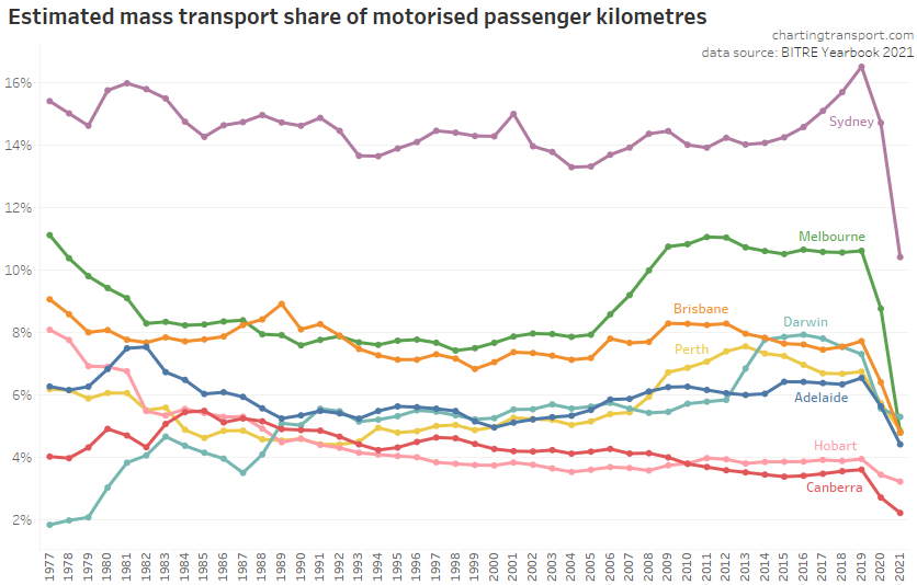 This chart produces some unexpected outliers. Hobart shows up with very high public transport trips per capita in the 1970s, which might be relate to the Tasman Bridge Disaster which severed the bridge between 1975 and 1977 and resulted in significant ferry traffic for a few years (over 7 millions trips in 1976-77). Canberra also shows up with remarkably high trips per capita in the 1980s for a relatively small, low density, car-friendly city, but has been in steady decline since.