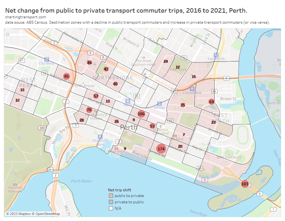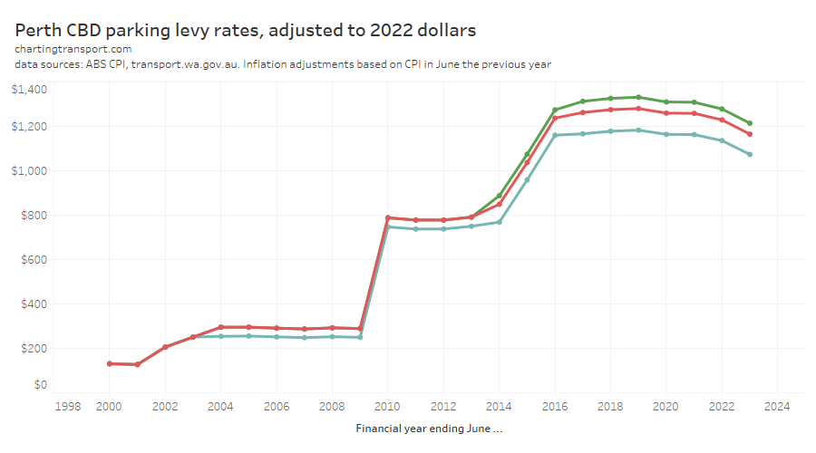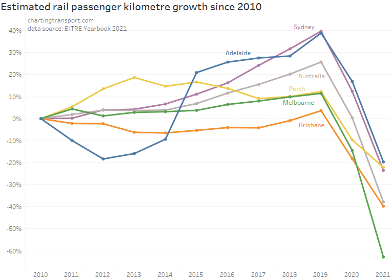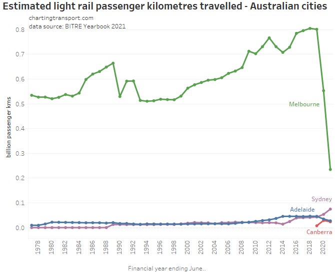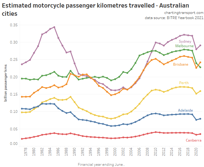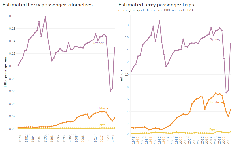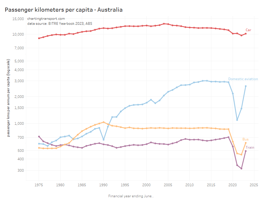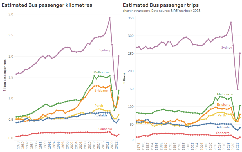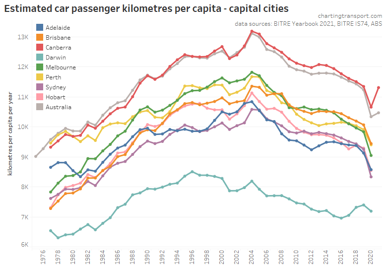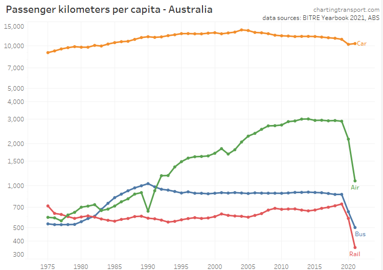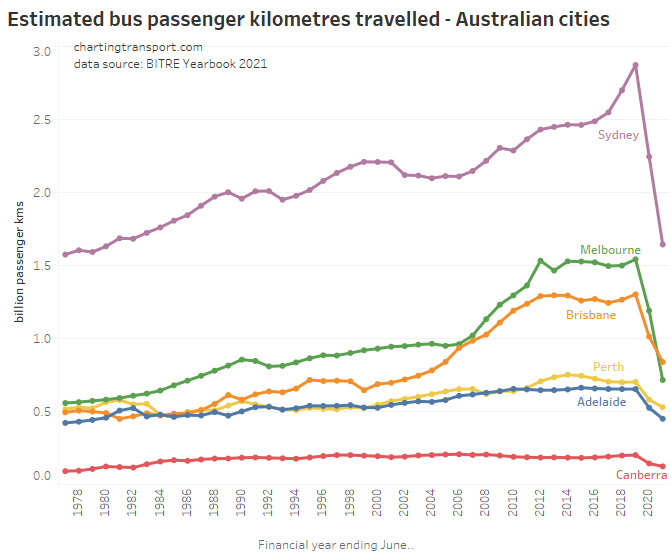 This chart produces some unexpected outliers. Hobart shows up with very high public transport trips per capita in the 1970s, which might be relate to the Tasman Bridge Disaster which severed the bridge between 1975 and 1977 and resulted in significant ferry traffic for a few years (over 7 millions trips in 1976-77). Canberra also shows up with remarkably high trips per capita in the 1980s for a relatively small, low density, car-friendly city, but has been in steady decline since.