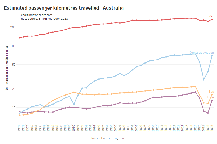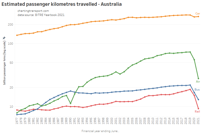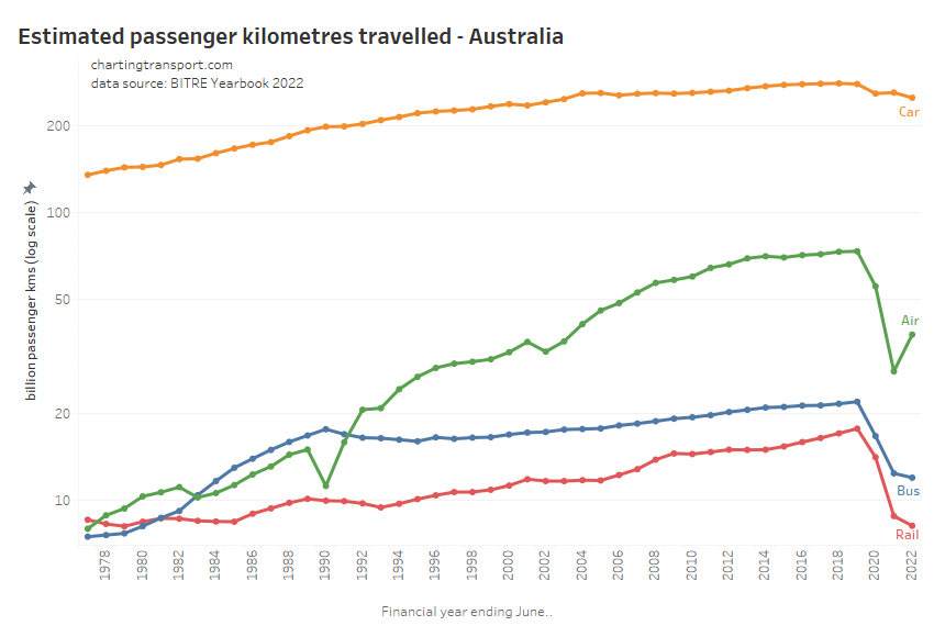Here are passenger kilometres travelled overall (log scale):