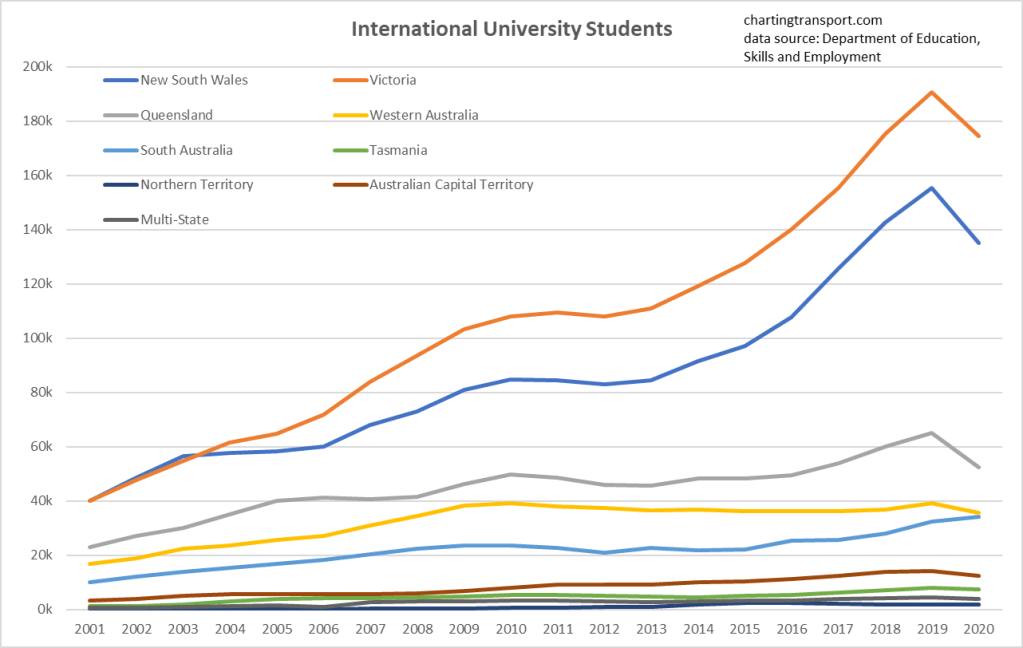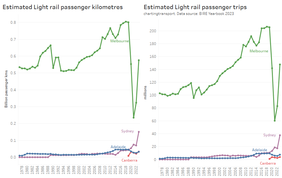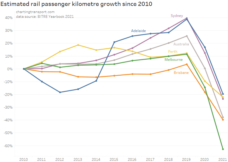The BITRE data is reported as “trips”, but comparing with other sources it appears the figures are boardings rather than journeys. Most agencies unfortunately don’t report public transport journeys at this time, however boardings to journeys ratio could be estimated from household travel survey data for some cities.