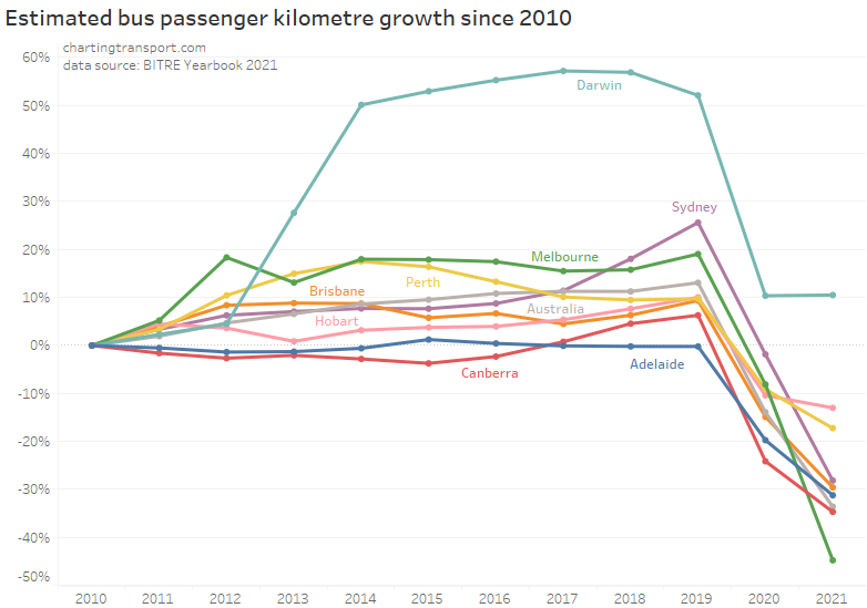 Darwin had elevated bus passenger kilometres from 2014 to 2019 due to bus services to a resources project (BITRE might not have counted these trips as urban public transport).