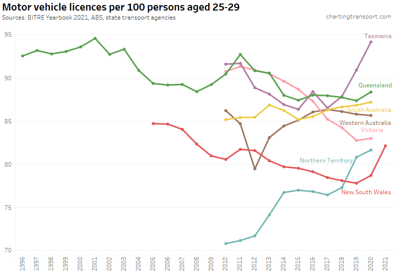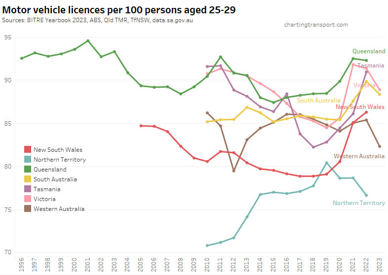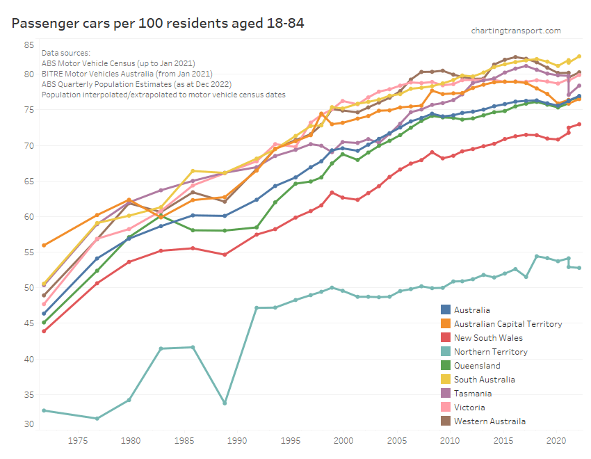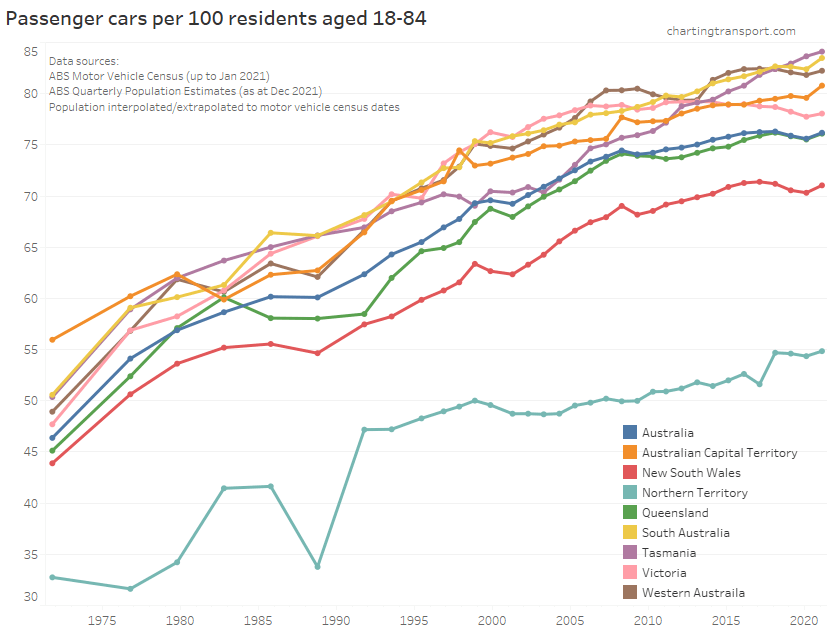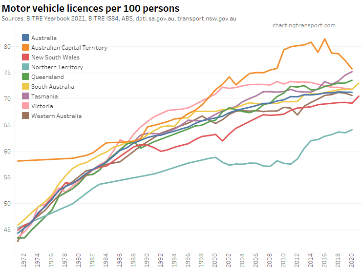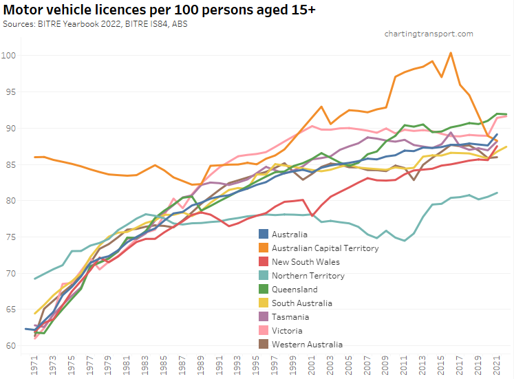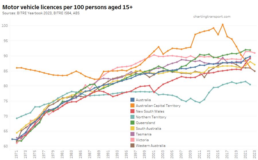 Here is motor vehicle licence ownership for people aged 15+ back to 1971 (I’d use 16+ but age by single-year data is only available at a state level back to 1982). Note this includes any form of driver’s licence including learner’s permits.