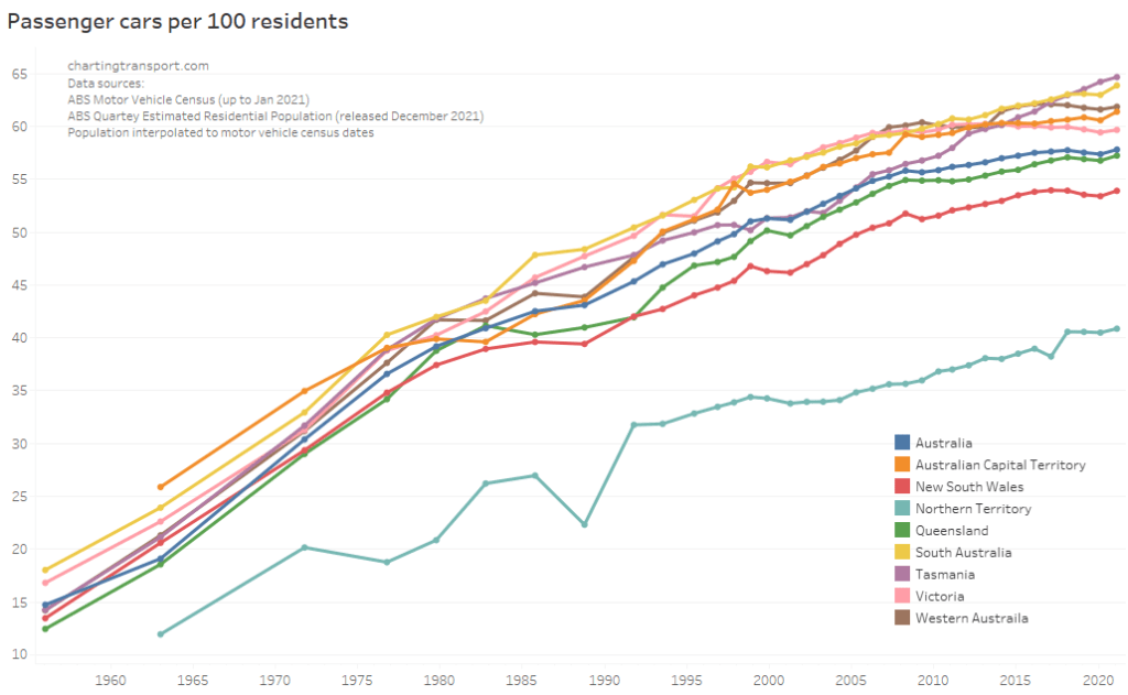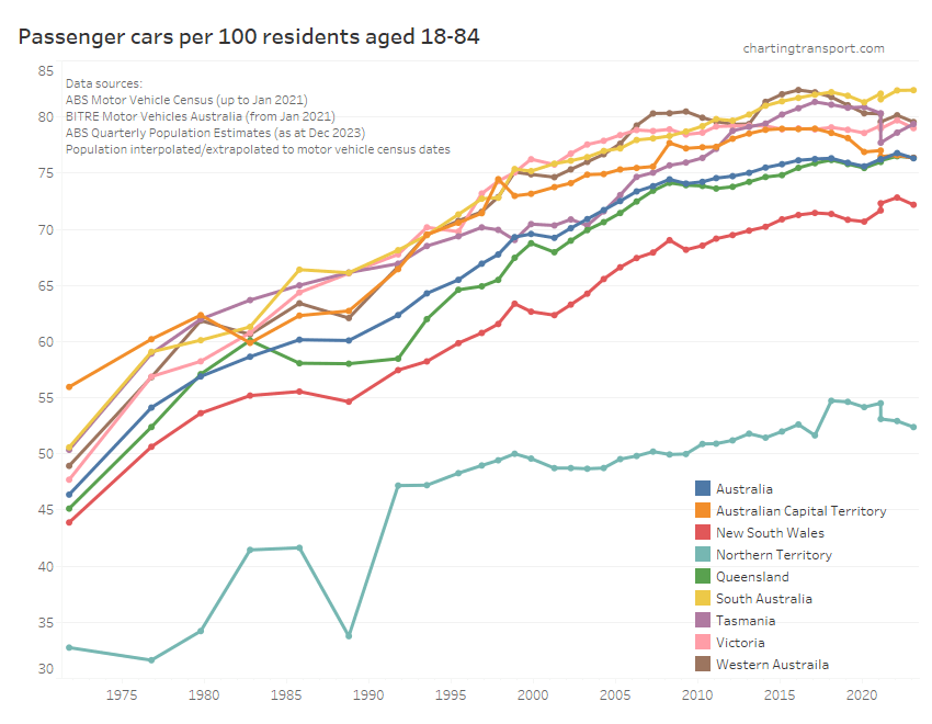 The data series for the ACT is unusually different in trends and values – with very high but declining rates in the 1970s, seemingly elevated rates from 2010 to around 2018, followed by a sharp drop. BITRE’s Information Sheet 84 (published in 2017) reports that ACT licences might remain active after people leave the territory (e.g. to nearby parts of NSW) because of delays in transferring their licences to another state, resulting in a mismatch between licence holder counts and population. However, New South Wales requires people to transfer their licence within 3 months of moving there, and other states likely do also. But that requirement might be new, changed, and/or differently enforced over time (please comment if you know more).