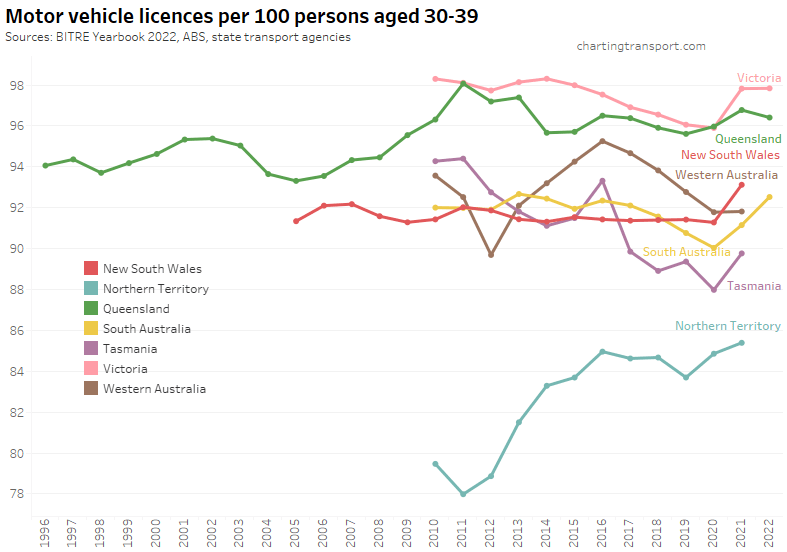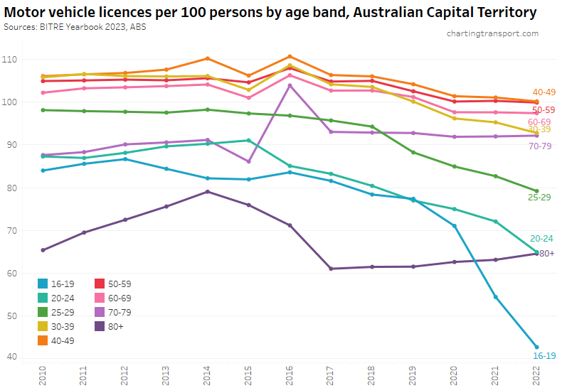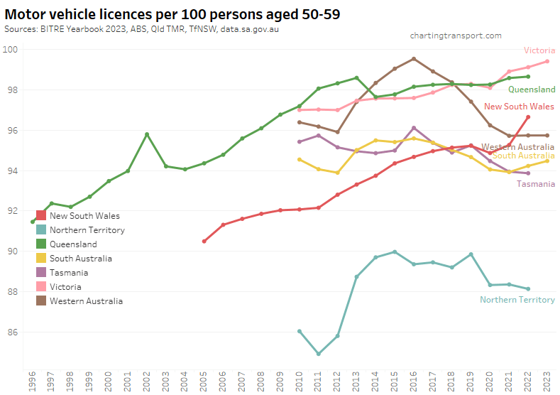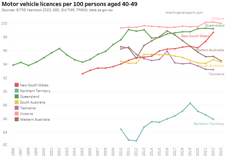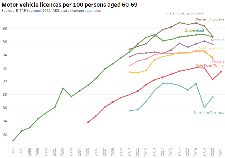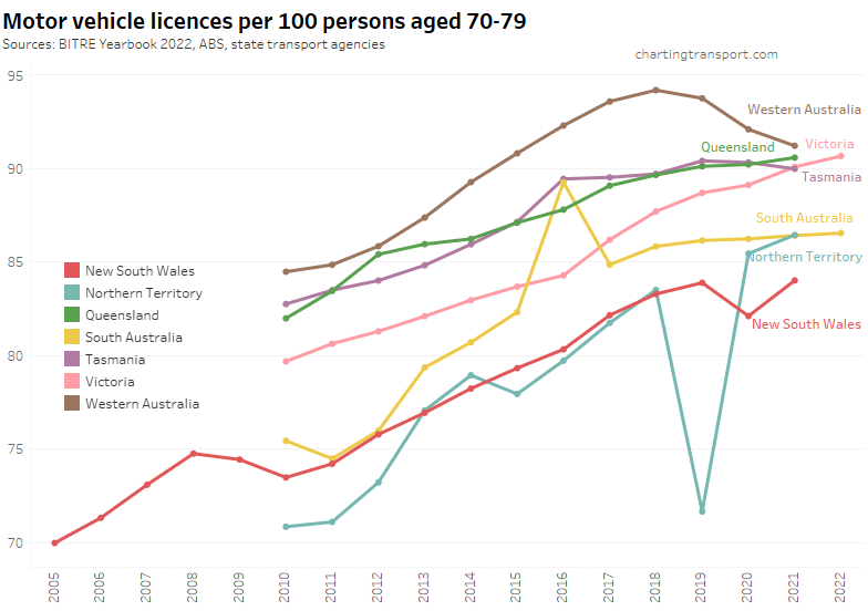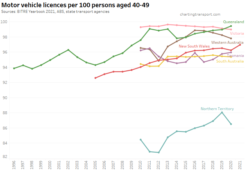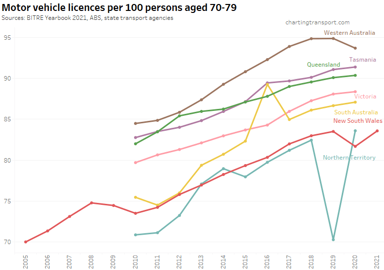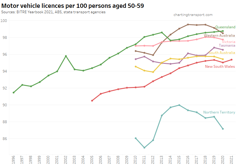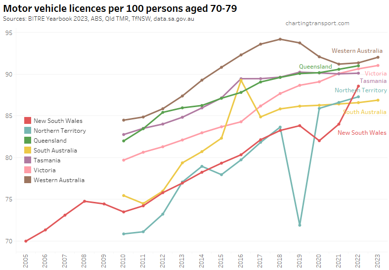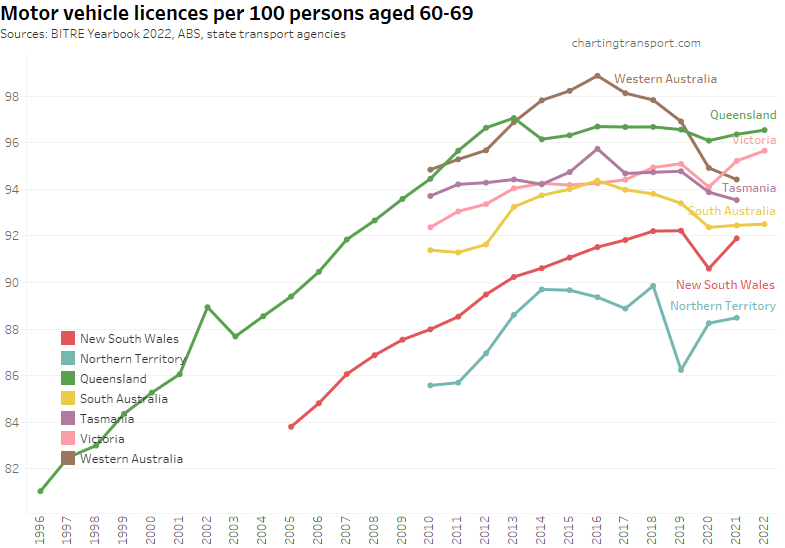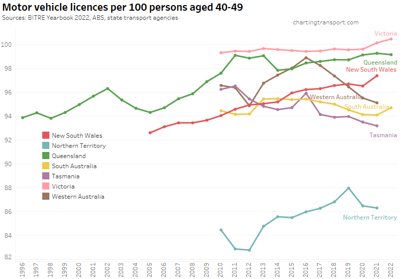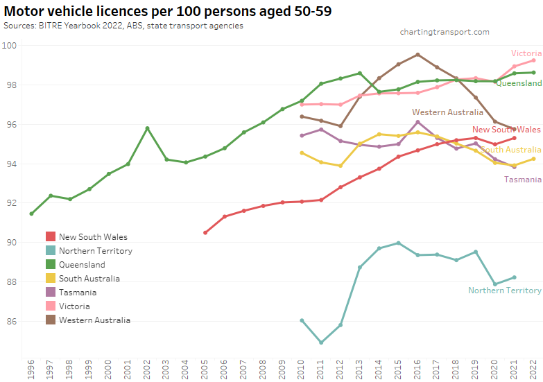 Many age bands exceed 100 (more licence holders than population) and there are some odd kinks in the data around 2015-2017 for all age bands (especially 70-79). I’m not sure that it is plausible that licencing rates of teenagers might have plummeted quite so fast in recent years. I’m inclined to treat all of this ACT data as suspect, and I will therefore exclude the ACT from further charts with state/territory disaggregation.