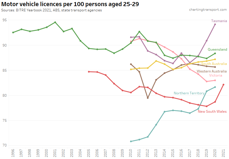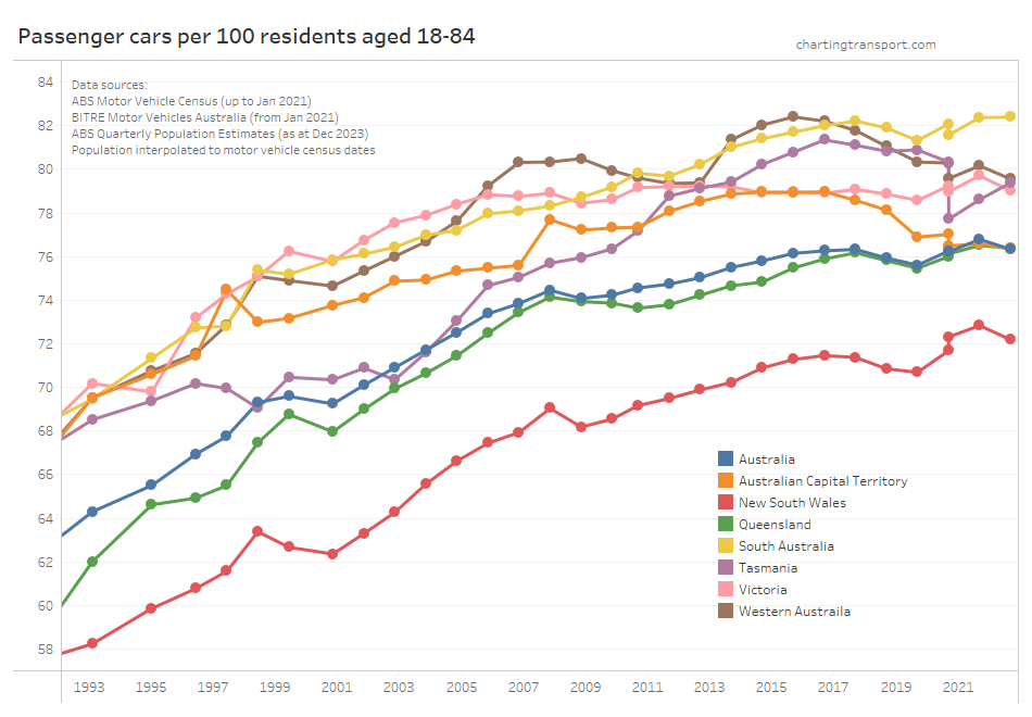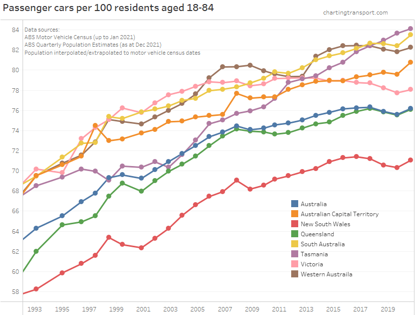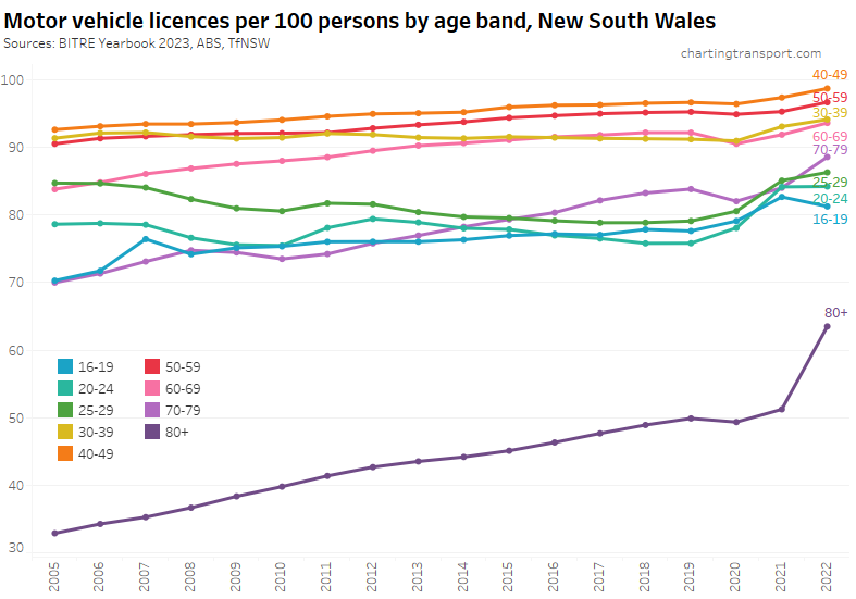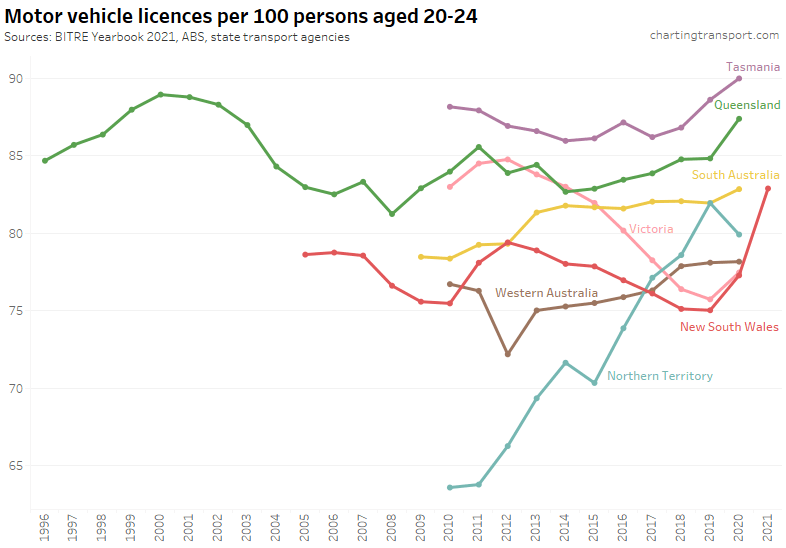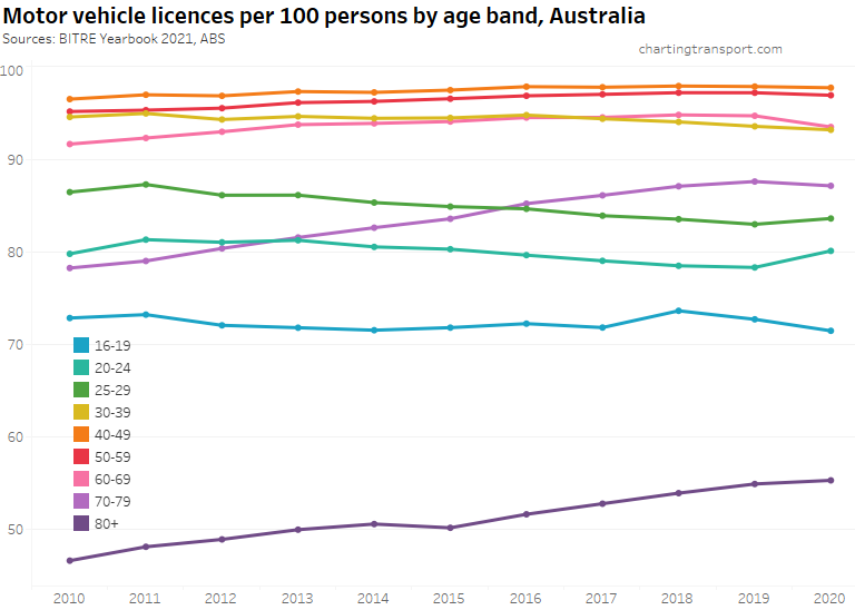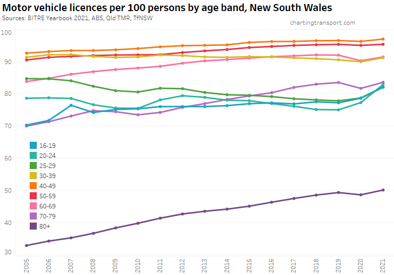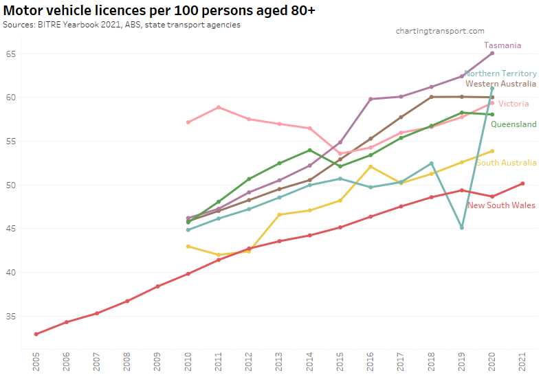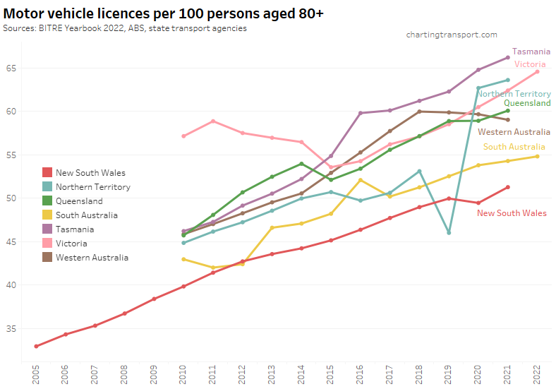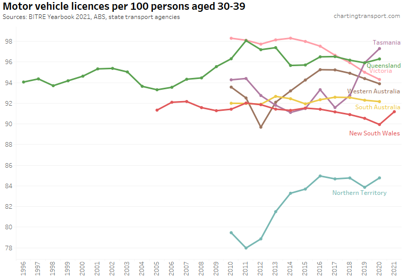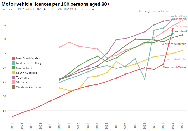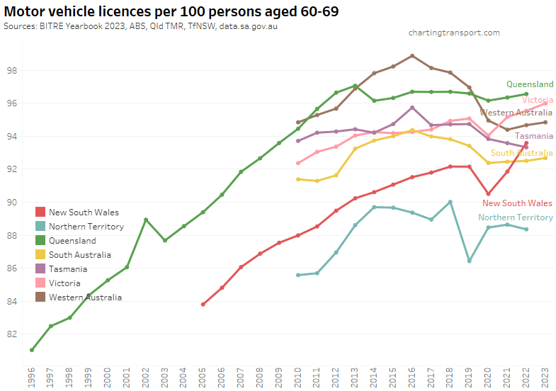 Many age bands exceed 100 (more licence holders than population) and there are some odd kinks in the data around 2015-2017 for all age bands (especially 70-79). I’m not sure that it is plausible that licencing rates of teenagers might have plummeted quite so fast in recent years. I’m inclined to treat all of this ACT data as suspect, and I will therefore exclude the ACT from further charts with state/territory disaggregation.