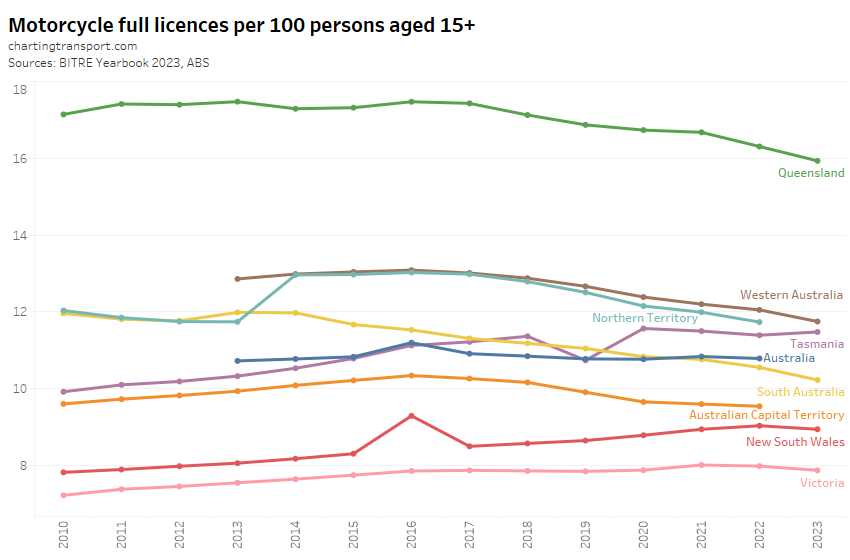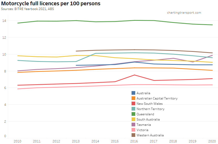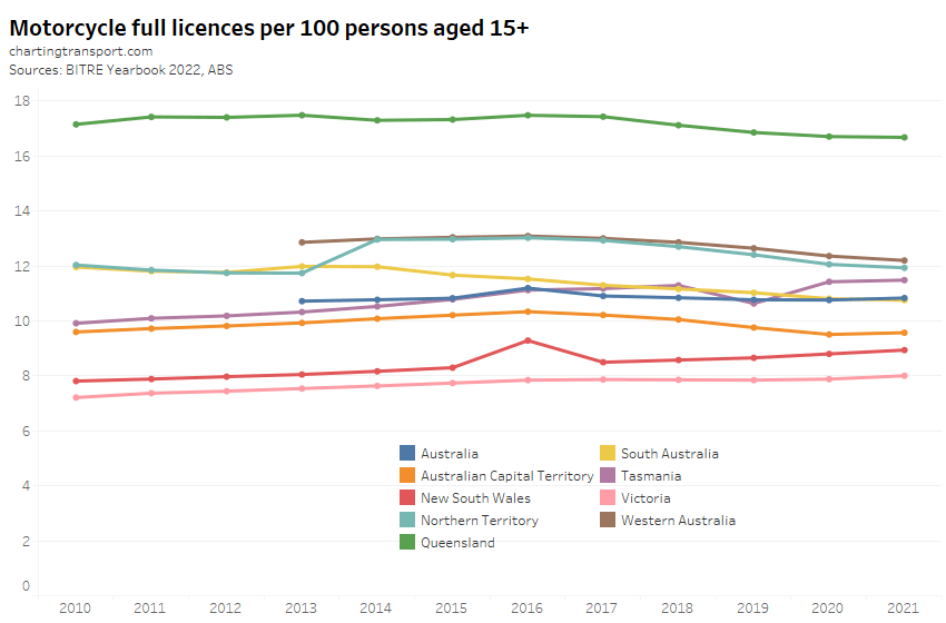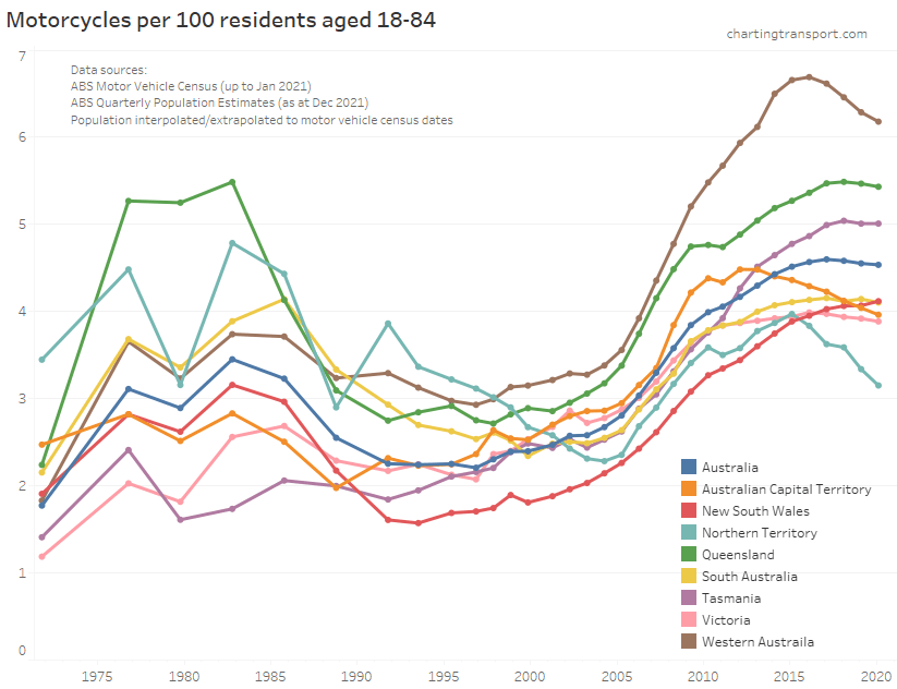 Motorcycle licence ownership per capita has been declining in most states and territories, except Tasmania. I suspect dodgy data for New South Wales 2016, and Tasmania 2019.