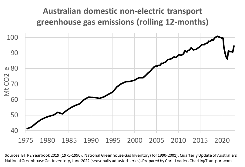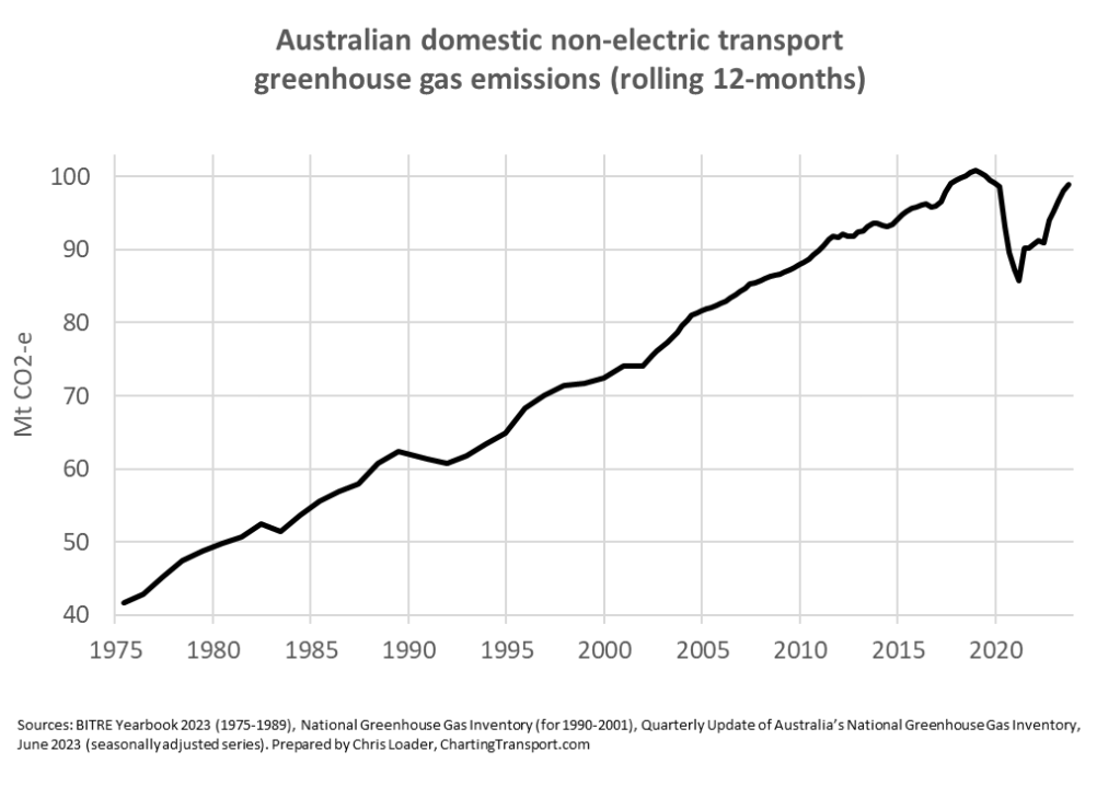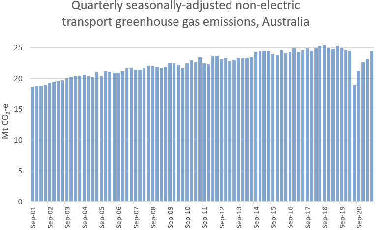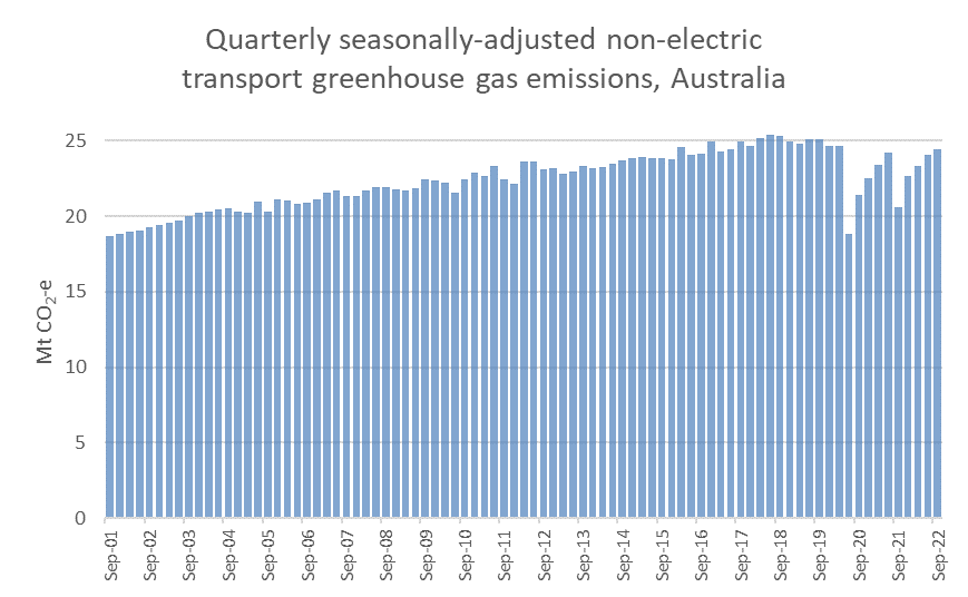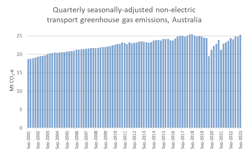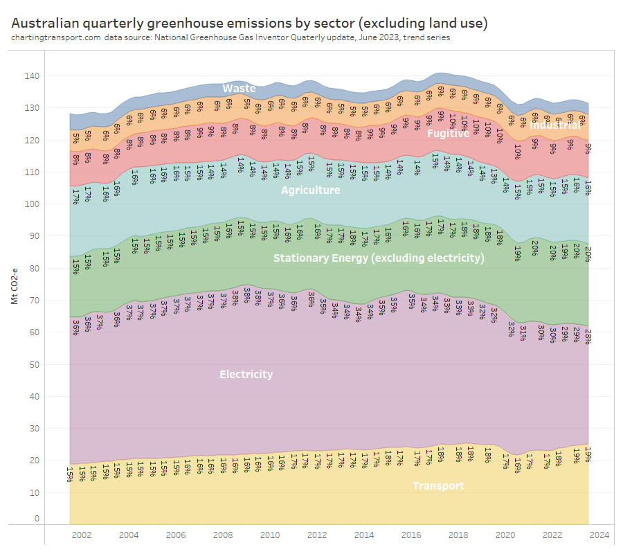 Transport now makes up 19% of Australia’s greenhouse gas emissions (excluding land use), up from 15% in 2001: