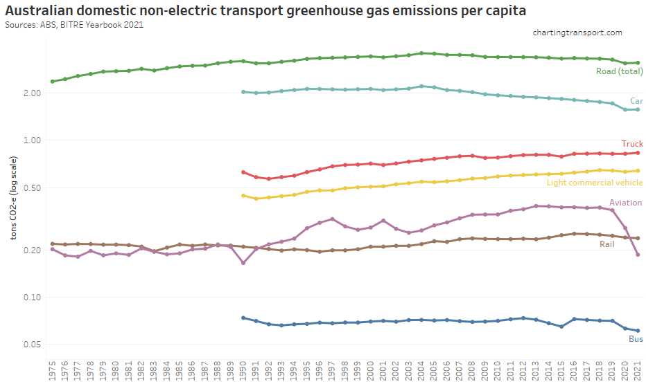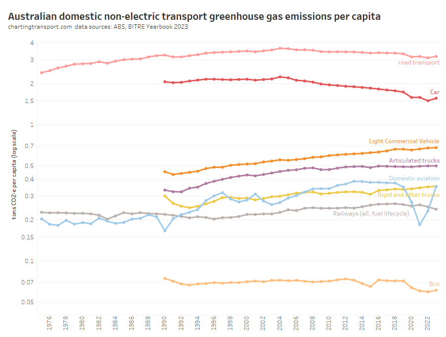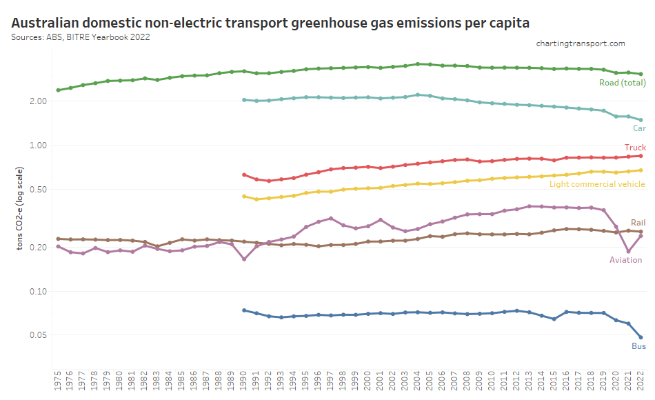 Here are per capita emissions by transport sector (note: log scale used on Y-axis):