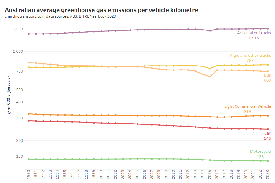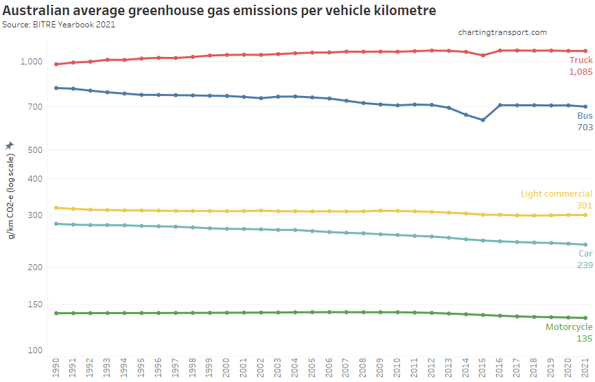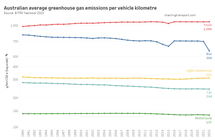 Next up, emissions intensity (per vehicle kilometre):