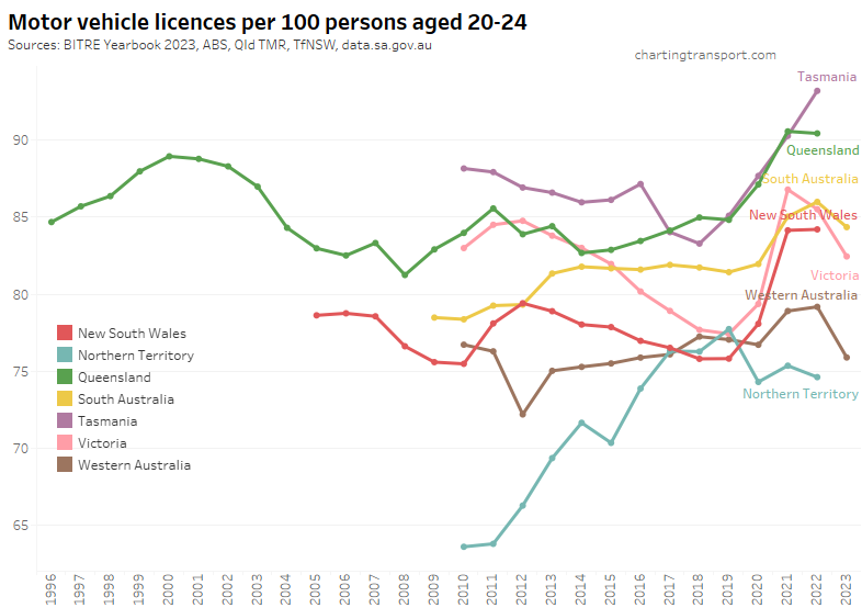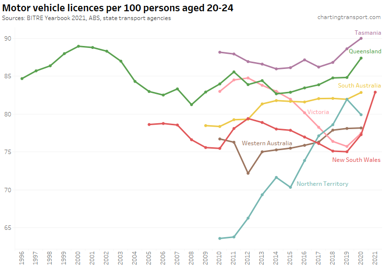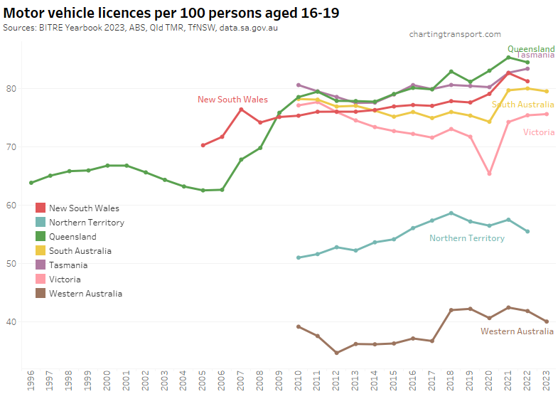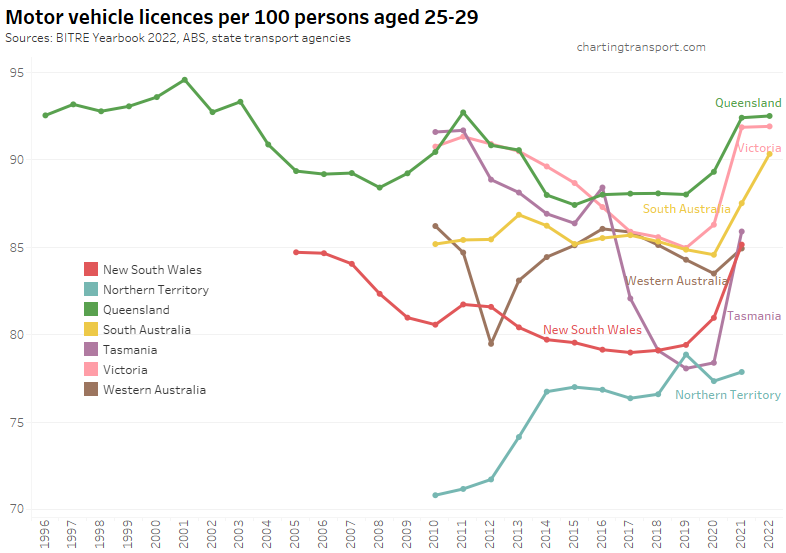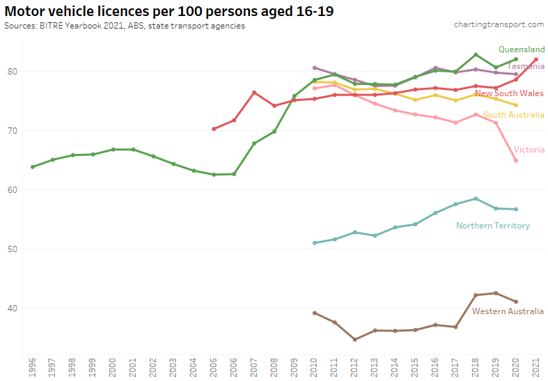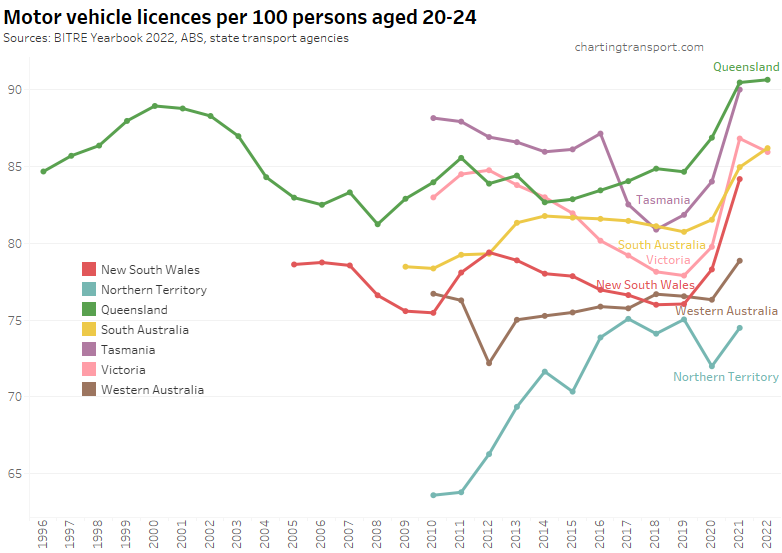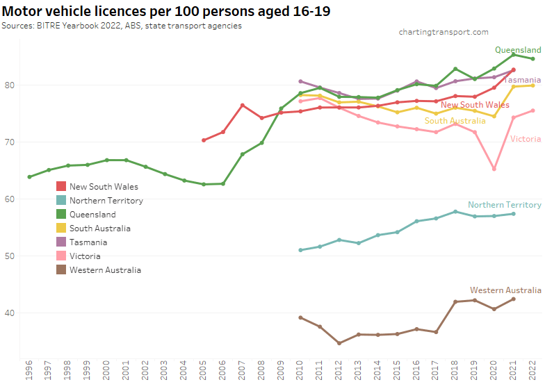 Victoria saw a sharp decline in Victoria to June 2020, followed by a bounce back to a higher rate in 2021. The pandemic has also been associated with increased rates in South Australia, Tasmania, and New South Wales (although it dropped again in 2022). Western Australia and the Northern Territory have much lower licence rates, likely due to different eligibility ages for learner’s permits.