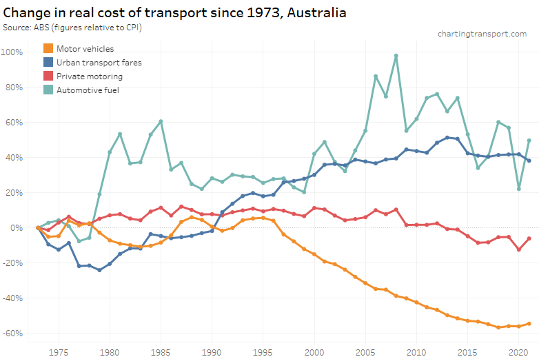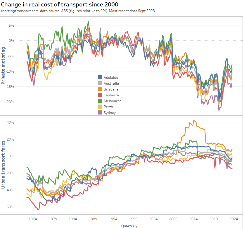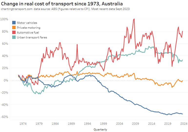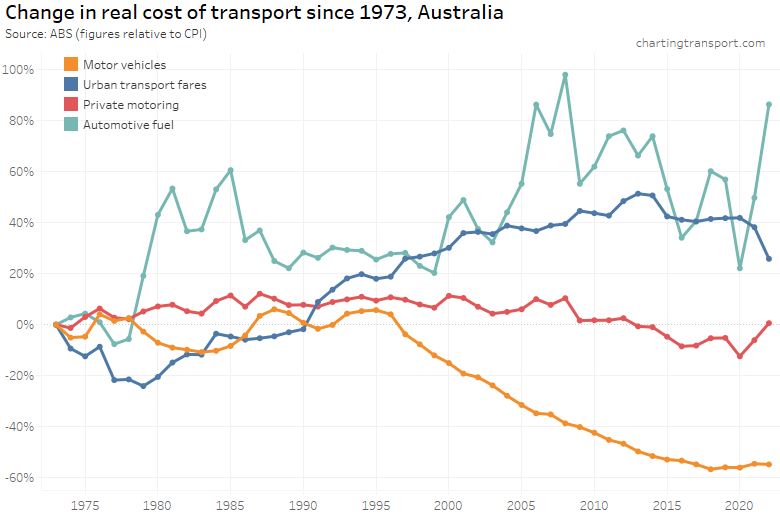 Urban transport fares (a category which unfortunately blends public transport and taxis/rideshare) have increased faster than CPI since the late 1970s, although they were flat in real terms between 2015 and 2020, then dropped in 2021 and 2022 in real terms – possibly as they had not yet been adjusted to reflect the recent surge in inflation. They picked up slightly in 2023.