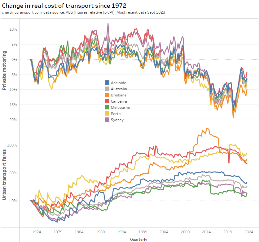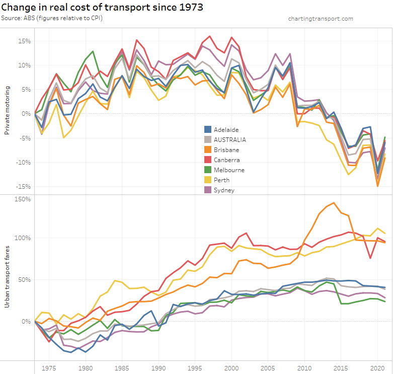 The above chart shows a weighted average of capital cities, which washes out patterns in individual cities. Here’s a breakdown of the change in real cost of private motoring and urban transport fares since 1972 by city (note different Y-axis scales):