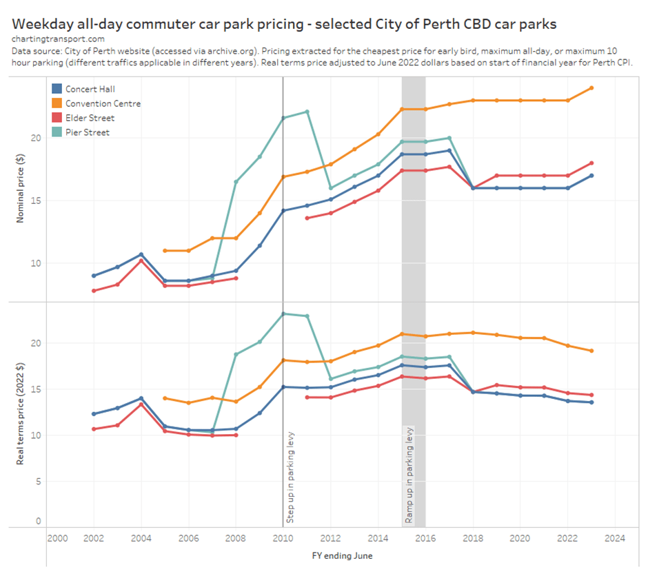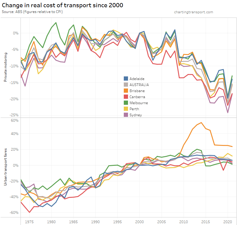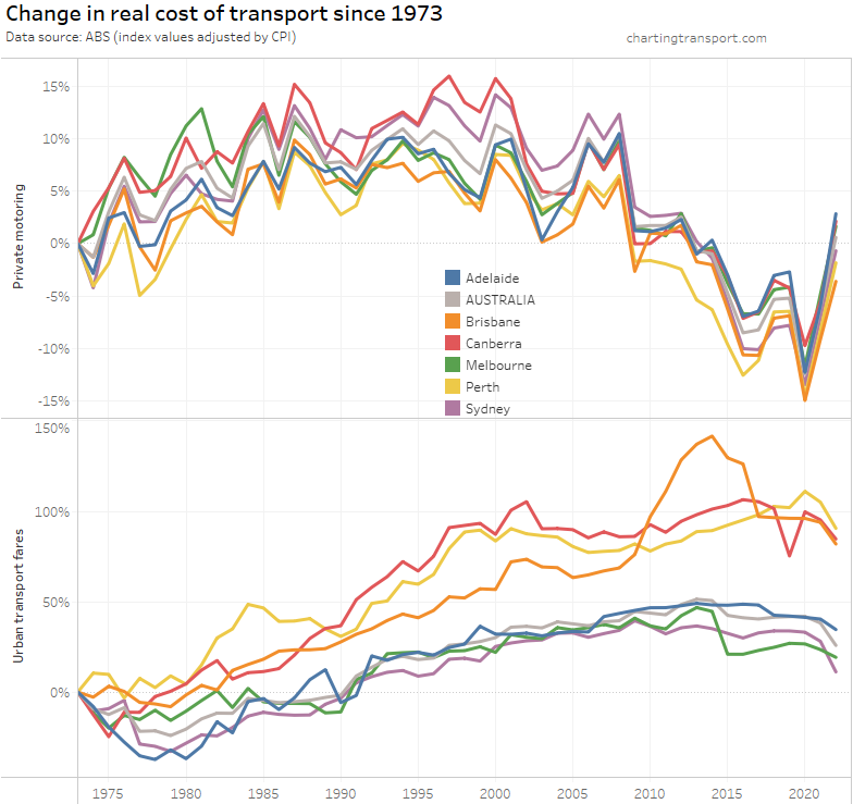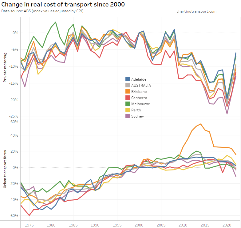 What’s most relevant is the relative change between years – e.g. you can see Brisbane’s experiment with high urban transport fare growth between 2009 and 2017 in both charts.