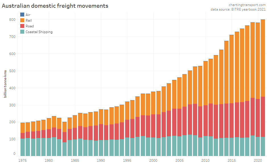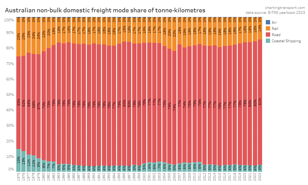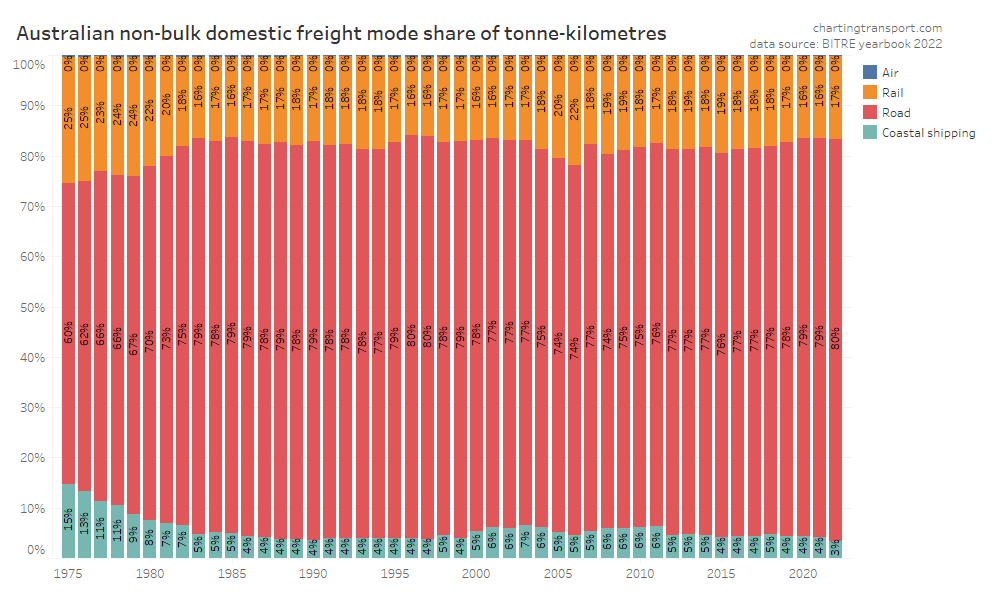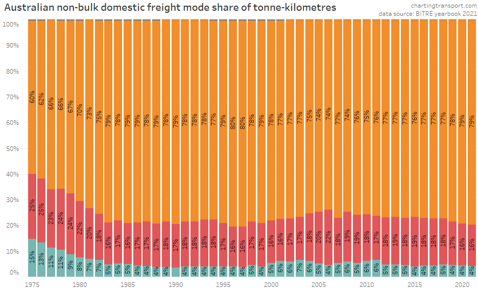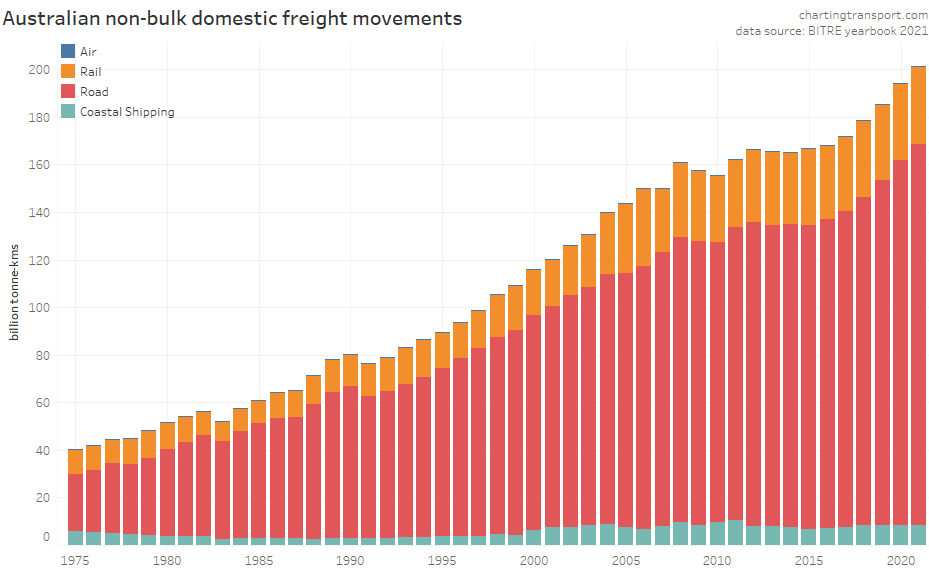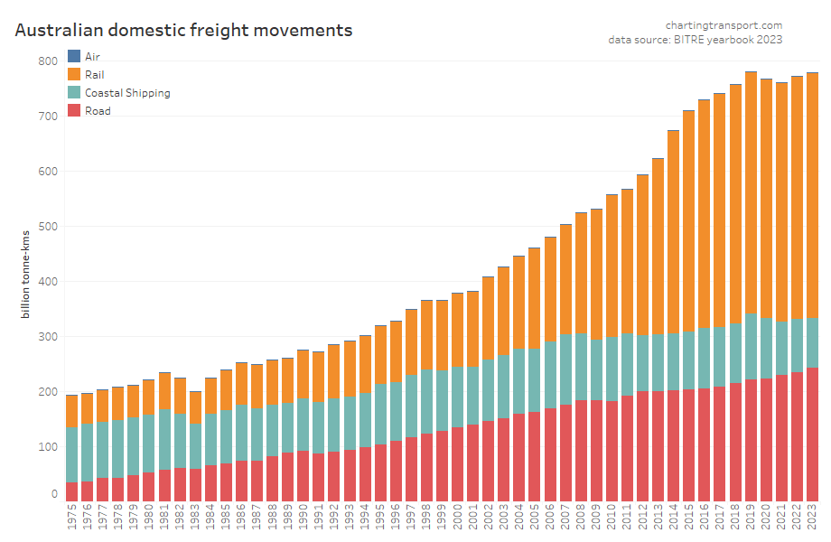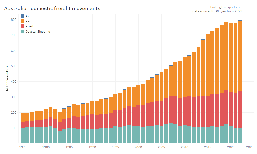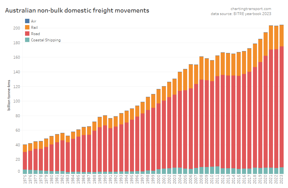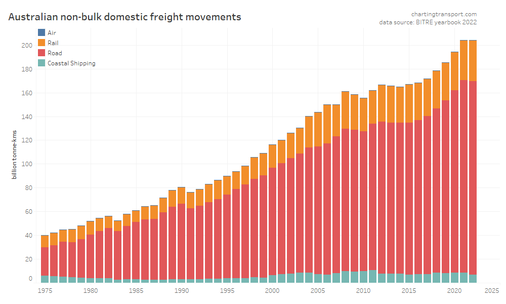 This data shows a dramatic change in freight volume growth around 2019, with a lack of growth in rail volumes, a decline in coastal shipping, but ongoing growth in road volumes. Much of this volume is bulk commodities, and so the trends will likely be explained by changes in commodity markets, which I won’t try to unpack.