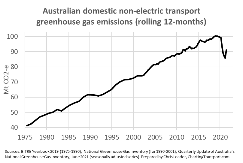 Australia’s transport rolling 12 month emissions dropped significantly with COVID lockdowns, but are bouncing back strongly: