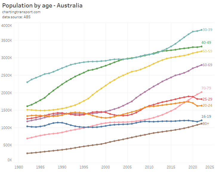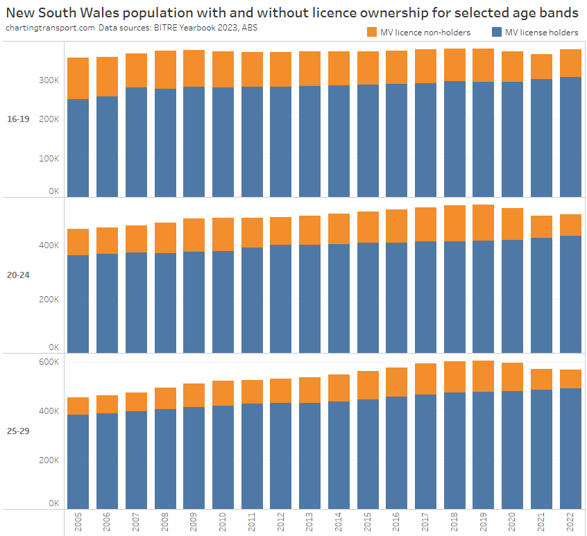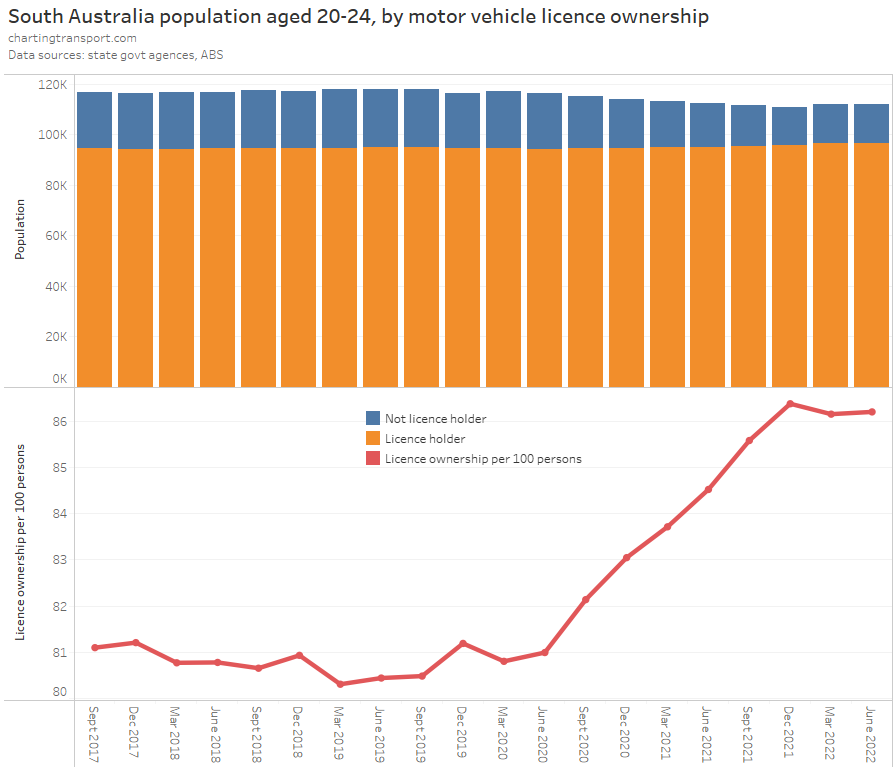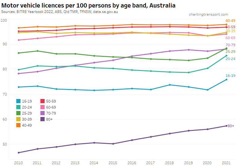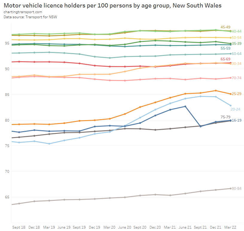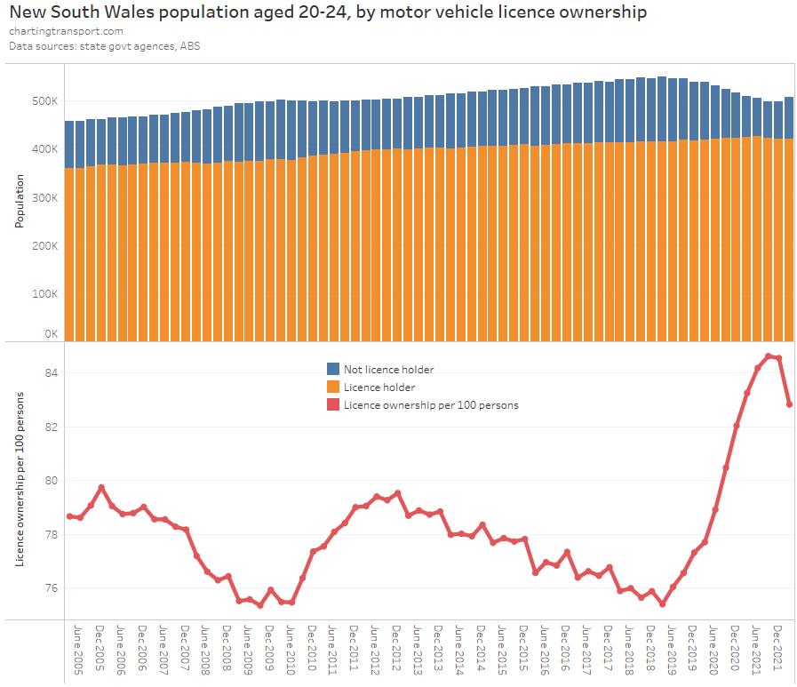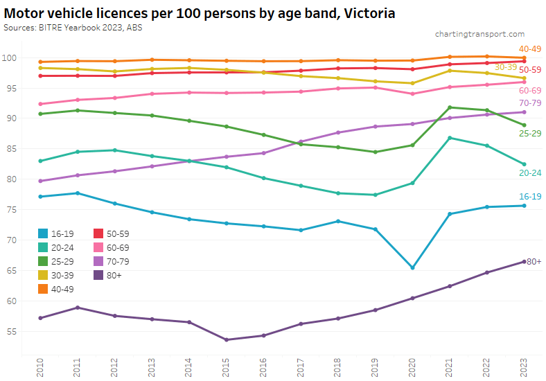 Victoria saw a decline in licence holders in 2020 (likely teenagers unable to get a learner’s permit due to lockdowns), but the number of teenage licence holders has since grown. While for those in their 20s, the increase in the licence ownership rate is mostly explained by a loss of population without a licence: