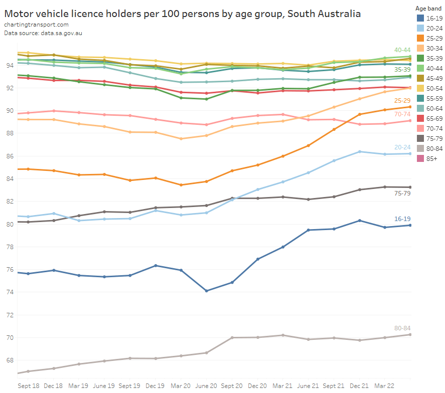 Here’s licence ownership by age band for Australia as a whole (to June 2022):