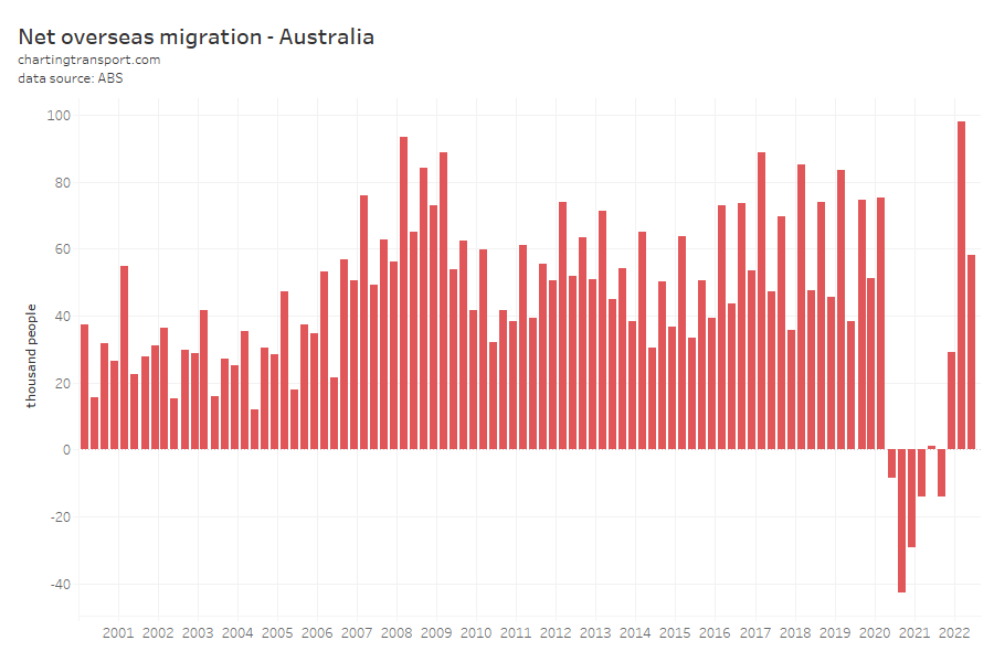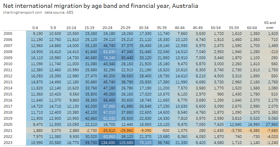 Curiously as an aside, 2019-20 saw a big increase in older people migrating to Australia (perhaps people who were overseas returning home during the pandemic lock downs). But then big negative numbers were seen in 2020-21, and since then there has continued to be net departures in 65+ age band.