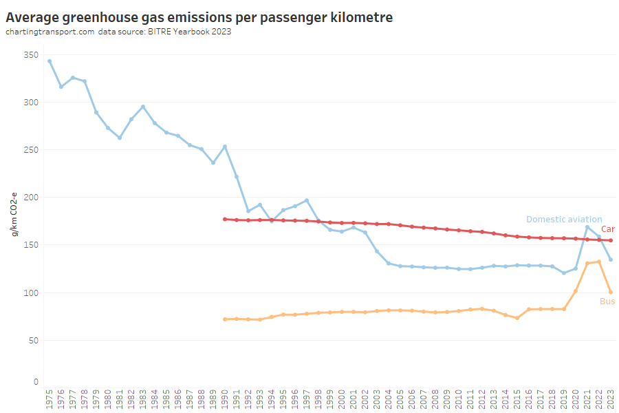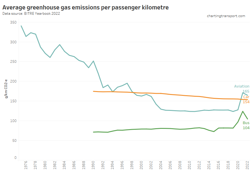 Aviation was reducing emissions per passenger kilometre strongly until around 2004, but has been relatively flat since, and the 2022-23 value is above 2004 levels. This seems a little odd as newer aircraft are generally more energy efficient.