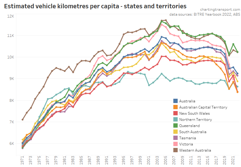 Vehicle kilometres per capita peaked around 2004-05 and were starting to flatline in some states before the pandemic hit with obvious impacts. In 2022-23 vehicle kilometres per capita increased in all states and territories except the Northern Territory and Tasmania.