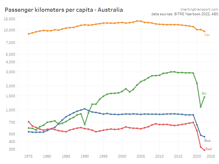 Curiously aviation passenger kilometres per capita peaked in 2014, well before the pandemic. Rail passenger kilometres per capita in 2019 were at the highest level since 1975.