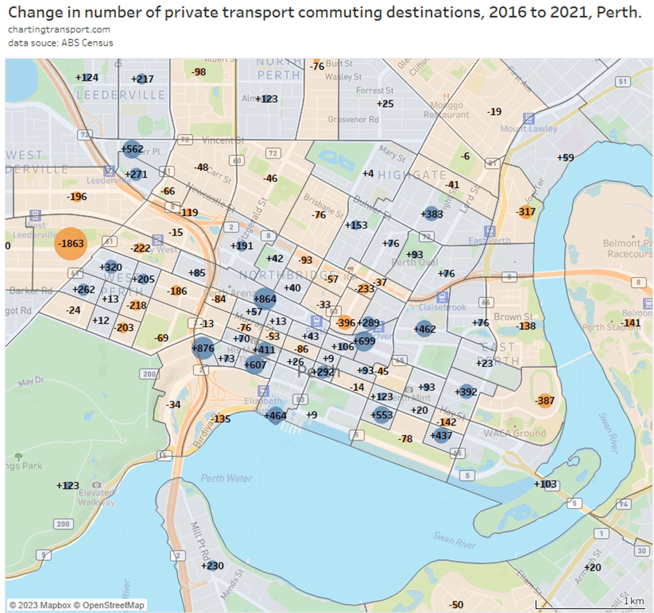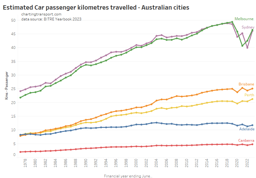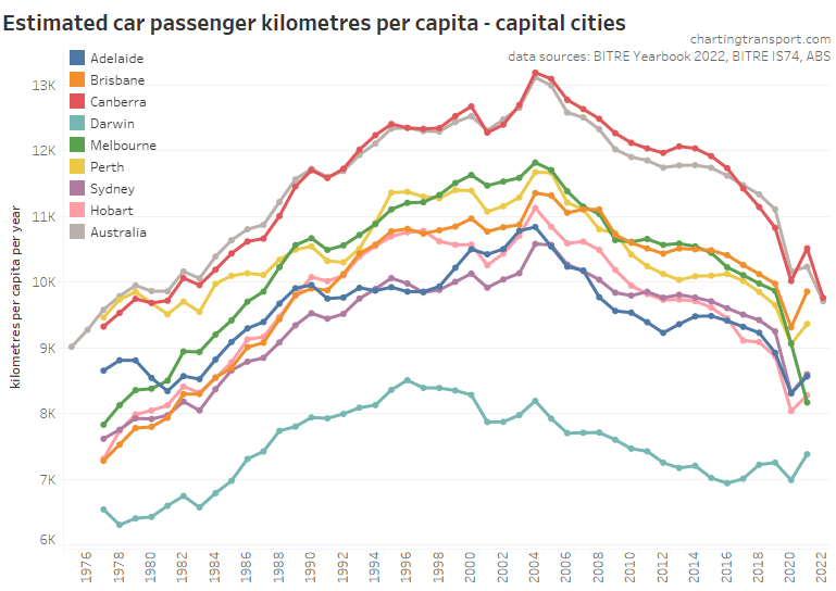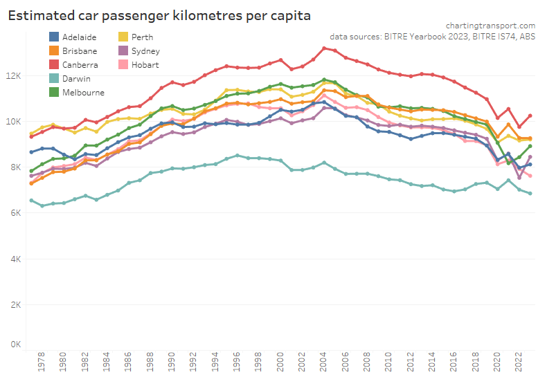 Here’s total car passenger kilometres for cities: