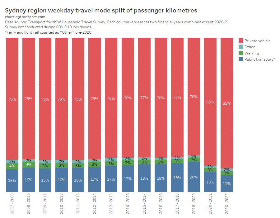 The relative estimates of share of motorised passenger kilometres are quite different to the estimates of passengers trips per capita we saw just above. Canberra is much lower than the other cities, and Brisbane and Melbourne are closer together. The passenger kilometre estimates rely on data around average trip lengths (which is probably not regularly measured in detail in all cities), while the passenger boardings per capita figures are subject to varying transfer rates between cities. Neither are perfect.